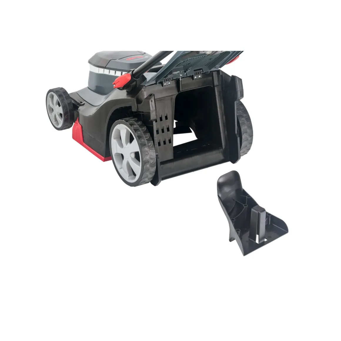 - Lieferumfang: Rasenmäher; Fangbox, 2x Akku, Ladegerät