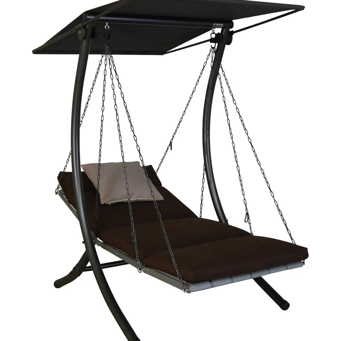 Die moderne 1-Sitzer Hollywoodschaukel Luxus ist ein echtes Designerstück und zählt zu den High-End Hollywoodschaukel Modellen der Firma Angerer. Mit ihrer kompakten Größe findes sie selbst auf dem Balkon, der Terrasse oder dem kleinen Vorgarten Platz. Die ergonomisch geformte Sitzfläche besteht aus robustem und witterungsbeständigem Kunststoff. Dank der Kettenaufhängung kann die Sitz- und Liegeposition individuell verstellt werden. Je nachdem, welche Position gewünscht ist, können die mitgelieferten Karabiner in jedes beliebige Kettenglied eingehängt werden. Neben der klassischen Sitzposition kann die Schaukelbank in eine Liegefläche oder eine U-förmige Position umgewandelt werden. Der Clou: trotz abgeklappter Lehne lässt es sich noch bequem Schaukeln. Mittels der Feststellhaken kann der Sitz aber auch fixiert werden. Die Sitzauflage hat ein extra dick gepolstertes Kopfteil, das mit einer schönen Logo-Stickung verziert ist. Alle Kissenbezüge sind aus einem besonders weichen Stoff gefertigt und lassen sich dank der praktischen Reißverschlüsse einfach abnehmen und bei 30° C in der Maschine waschen. Ein Sofakissen ist ebenfalls im Lieferumgang enthalten. Das robuste Gestell der Hollywoodschaukel besteht aus verzinktem und pulverbeschichtetem Stahl. Das Sonnendach ist aus wetterfestem Textilene Gewebe gefertigt und ebenfalls verstellbar. Durch Vor- oder Zurückschieben oder Neigen des Daches ist stets optimaler Sonnenschutz gegeben. Zur Selbstmontage, inkl. Montageanleitung. Made in Germany.