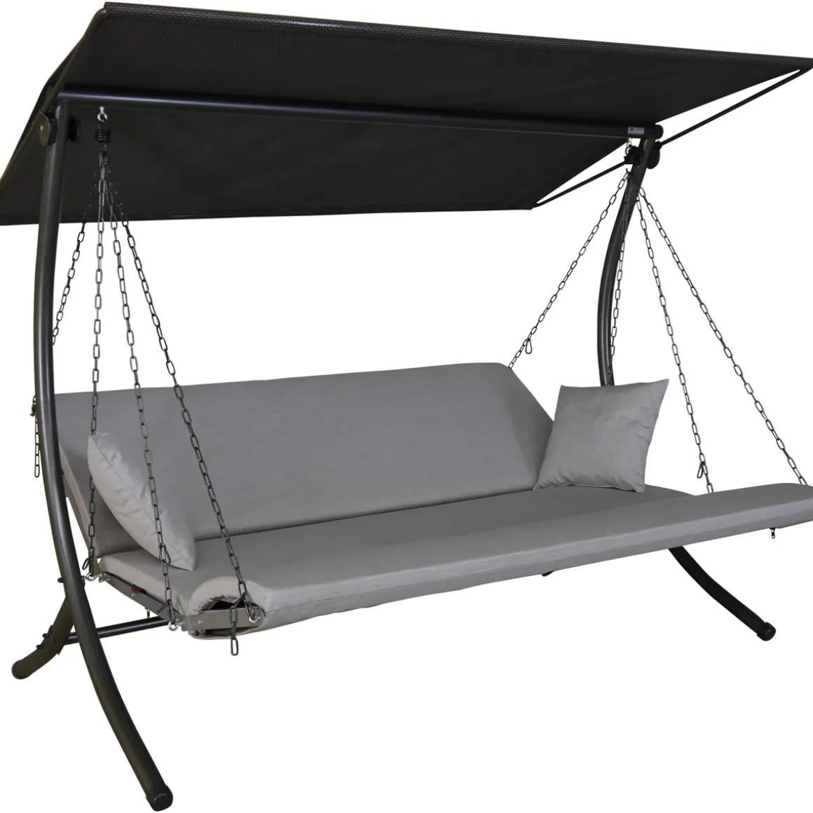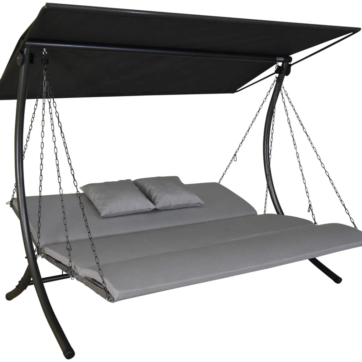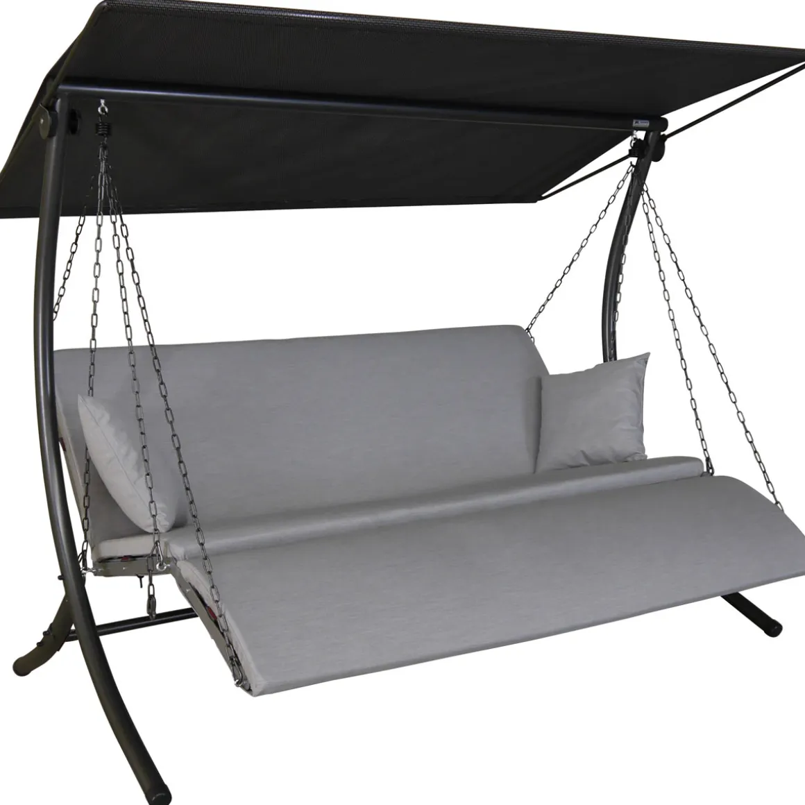 Die moderne 3-Sitzer Hollywoodschaukel Luxus Zip ist ein echtes Designerstück und zählt zu den High-End Hollywoodschaukel Modellen der Firma Angerer. Die ergonomisch geformte Sitzfläche besteht aus robustem und witterungsbeständigem Kunststoff. Dank der Kettenaufhängung kann die Sitz- und Liegeposition individuell verstellt werden. Je nachdem, welche Position gewünscht ist, können die mitgelieferten Karabiner in jedes beliebige Kettenglied eingehängt werden. Neben der klassischen Sitzposition kann die Schaukelbank in eine Liegefläche oder in eine U-förmige Position umgewandelt werden. Der Clou: trotz abgeklappter Lehne lässt es sich noch bequem Schaukeln. Mittels der Feststellhaken kann der Sitz aber auch fixiert werden. Die Sitzauflage besteht aus jeweils einem Lehnen-, Sitz- und Fußteil. Diese werden um den Sitz- und Lehnenrahmen gelegt und mit Reißverschlüssen daran befestigt, sodass diese nicht verrutschen können. Die Kissenbezüge bestehen aus einem wetterfesten Polyacryl-Stoff und sind mit einem schnelltrocknenden Schaumstoffkern gefüllt. Dank dieser speziellen Materialien können die Auflagen der Hollywoodschaukel Luxus Zip auch bei schlechter Witterung und sogar bei Regen auf der Schaukel bleiben. Vier passende Sofakissen sind ebenfalls im Lieferumgang enthalten. Das robuste Gestell der Hollywoodschaukel besteht aus verzinktem und pulverbeschichtetem Stahl. Das Sonnendach ist aus wetterfestem Textilene Gewebe gefertigt und ebenfalls verstellbar. Durch Vor- oder Zurückschieben oder Neigen des Daches ist stets optimaler Sonnenschutz gegeben. Zur Selbstmontage, inkl. Montageanleitung. Made in Germany.