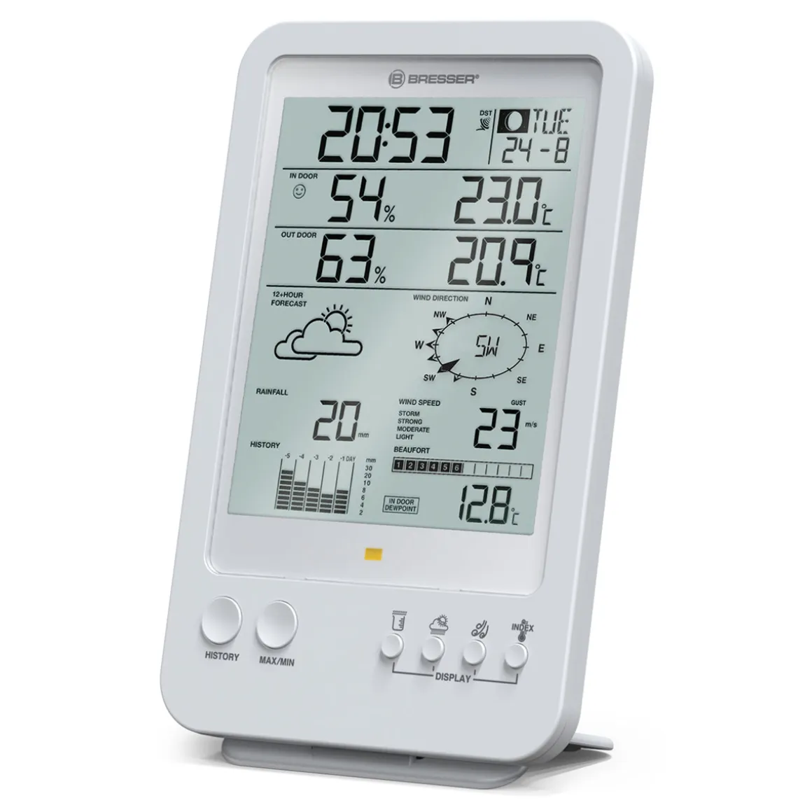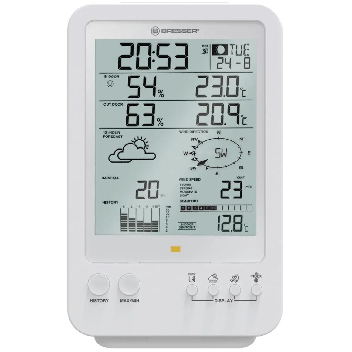 Der 5-in-1 Außensensor übermittelt zuverlässig Messwerte für die Windgeschwindigkeit, Windrichtung, Luftfeuchtigkeit, Temperatur und Niederschlagsmenge an die Basisstation. Auf dem klar strukturierten Display der Basisstation lassen sich nicht nur diese Werte, sondern auch eine Vielzahl von Historie-Daten ablesen. Letzteres ermöglicht die interne Speicherung und Auswertung der Messdaten über einen Zeitraum von 24 Stunden. Aus den gesammelten Messdaten errechnet die Wetterstation eine sehr verlässliche lokale Wettertrend-Vorhersage für die kommenden 12 Stunden, die im Display durch sechs grafische Symbole dargestellt wird.