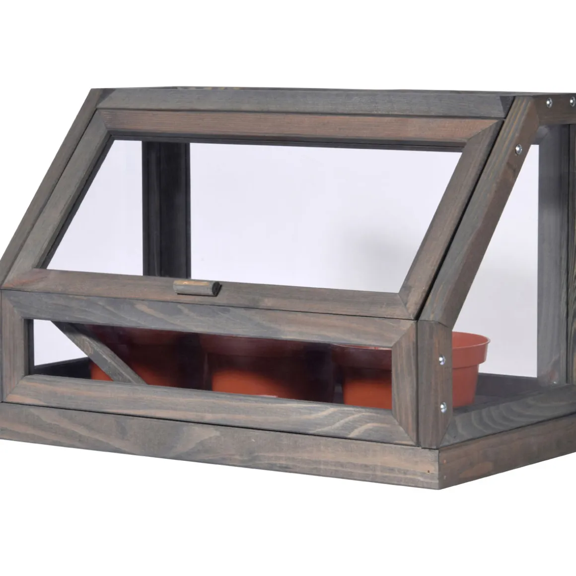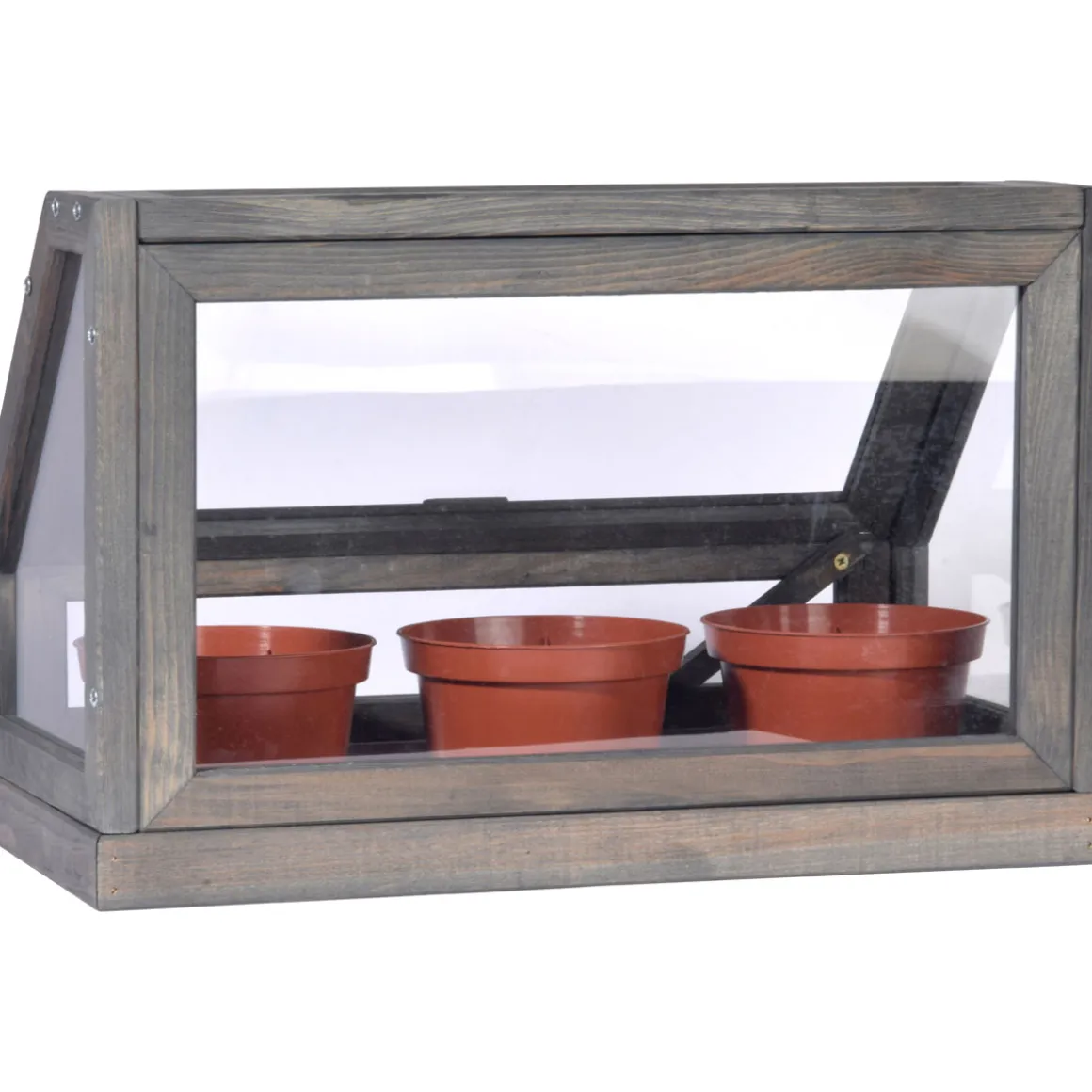 Das Mini-Gewächshaus eignet sich für die Anzucht von Kräutern und Jungpflanzen und kann in der Wohnung platziert werden. So werden die Pflanzen zuverlässig vor Kälte geschützt. Damit der Innenraum gut erreichbar ist, ist das Gewächshaus mit einer aufklappbaren Front ausgestattet. Die nötigen Plastiktöpfe sind bereits im Lieferumfang enthalten. Gefertigt ist der Rahmen des Gewächshauses aus Kiefernholz. UV-durchlässige Acrylglasscheiben ergänzen das Design. Wasser und Schmutz werden über eine separate Metallwanne aufgefangen. Die Maße des Pflanzkastens betragen BxHxT 38×24,5×20 cm.