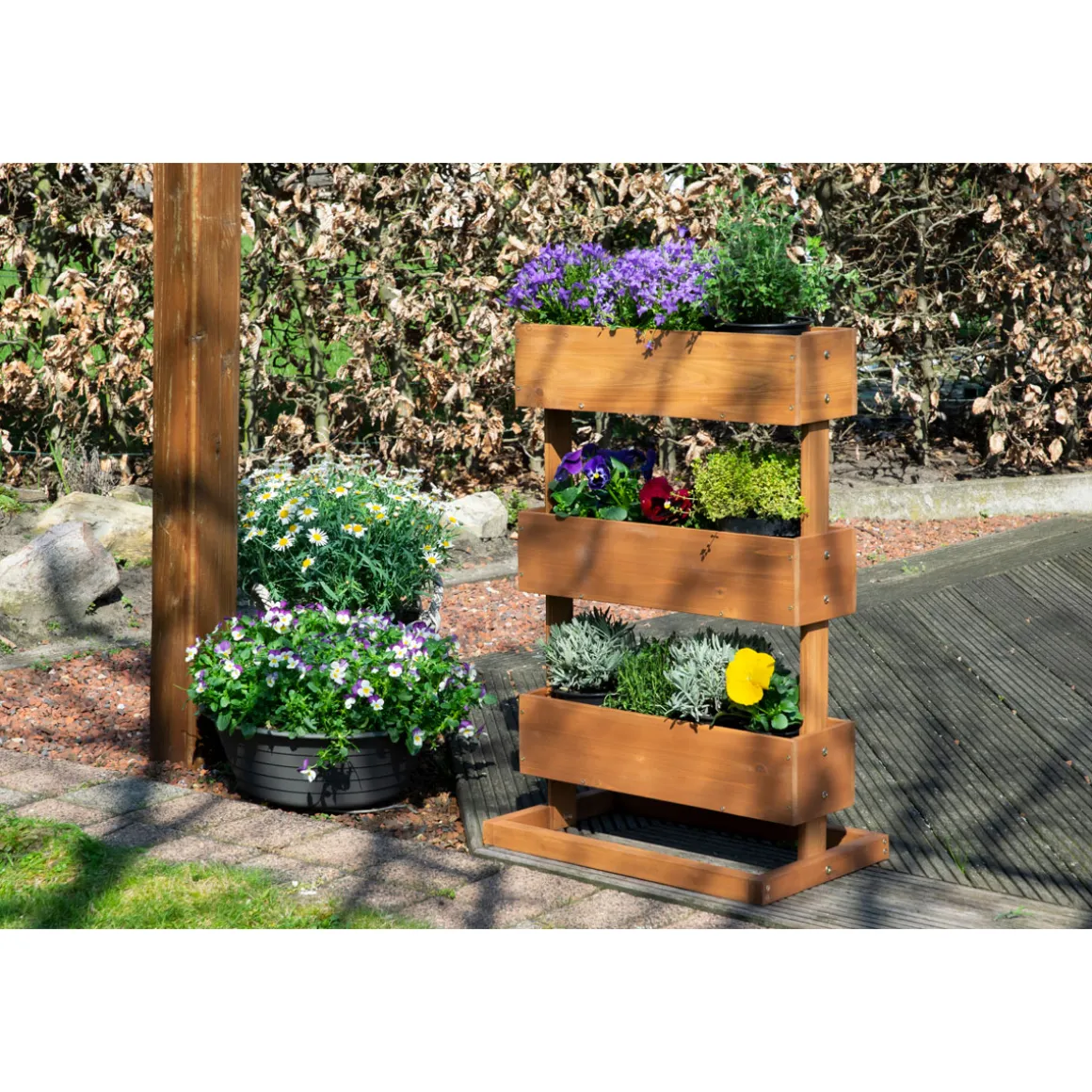 Sie träumen von einem grünen Paradies, das selbst auf kleinstem Raum gedeiht? Dann ist das dobar Vertikalbeet genau das Richtige für Sie! Mit seinem platzsparenden Design und der hochwertigen Verarbeitung aus wetterfest lasiertem Kiefernholz bringt es Natur pur direkt zu Ihnen nach Hause. Ob als Blumenbeet oder Kräuterbeet – dieses Hochbeet verwandelt Ihren Balkon, Ihre Terrasse oder Ihren Garten in eine grüne Oase voller Leben. Die drei separaten Pflanzkästen mit integrierter Pflanzfolie bieten Ihnen die Möglichkeit, Ihre Lieblingspflanzen individuell zu arrangieren und optimal zu pflegen. Lassen Sie Ihrer Kreativität freien Lauf und genießen Sie die Freude am Gärtnern!