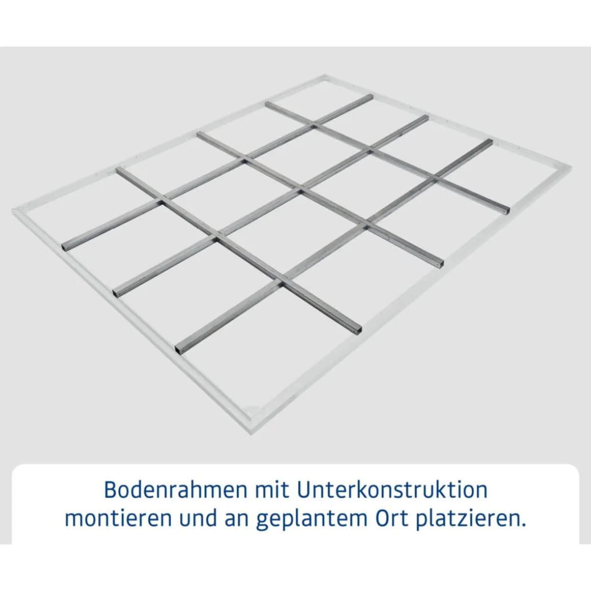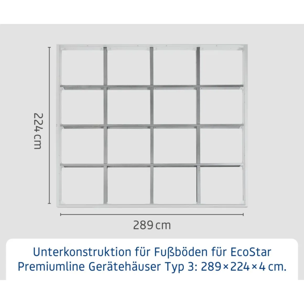 Um die optimale Belastbarkeit des EcoStar Riffelblechbodens zu geben, sollten Sie diesen mit der passenden Unterkonstruktion kombinieren. Die Anbringung der Konstruktion ist sehr einfach und gibt eine tragfähige, belastbare Bodenfläche in Ihrem EcoStar Gerätehaus.