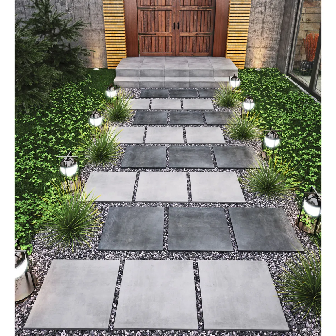 Terrassenfliese in grau, glasiert, rektifiziert, matte Oberfläche, Rutschsicherheitsgruppe 10, frostfest, Abriebgruppe 4, geringe Pflegeintensität, Steinoptik.
