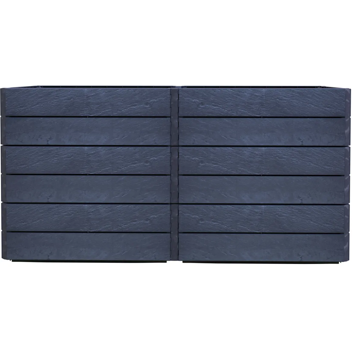 Garantia ERGO Hochbeet QUADRO 2 L 75 – Set bestehend aus 18 Paneelen inkl. Steckverbinder. Ergonomisches Arbeiten in bequemer Höhe – jederzeit flexibel erweiterbar. Das ERGO QUADRO Hochbeetsystem ist ein modular konzipiertes Hochbeet und ermöglicht Ihnen den Aufbau eines an Ihre Bedürfnisse und Platzverhältnisse angepasstes Hochbeet. Das QUADRO 2 L bietet mit seiner klassischen Hochbeet-Größe von 160 x 80 cm, die optimale Größe für den Anbau untschiedlichster Pflanzen. Es ergeben sich vielfältige Gestaltungsmöglichkeiten durch die vergrößerte Anbaufläche. Das ERGO QUADRO Hochbeet überzeugt ebenfalls als Blickfang in Ihrem Garten durch die dekorative Oberfläche in 3D-Steinoptik mit originalgetreuer Schieferstruktur, moderner Farbgebung, Langlebigkeit und UV-Stabilität. Bereits bei der Entwicklung eines GARANTIA Hochbeets wird sehr viel Wert auf ein nachhaltiges Produktdesign gelegt. Alle Hochbeete werden aus Recyclingkunststoff hergestellt und sind zu 100 % recycelbar. Im Gegensatz zu Hochbeeten aus anderen Materialien muss das ERGO QUADRO Hochbeet nicht gestrichen oder innen mit teurer Folie ausgelegt werden. Das im Lieferumfang enthaltene FLORA Wassersparsystem, schafft Ihnen einen reduzierten Wasserverbrauch und ein schnelleres Wachstum Ihrer Pflanzen. Das ERGO QUADRO Hochbeet kann auch multifunktional als offener Komposter oder Kräuterbeet genutzt werden. Durch die Befüllung mit Kompost und Gartenerde entsteht ein idealer Nährboden für die Pflanzenanzucht. Dank des guten Klimas im Inneren des Hochbeets können Pflanzen schneller reifen – unabhängig von der eigentlichen Bodenbeschaffenheit in Ihrem Garten. Neben Blühpflanzen gedeihen auch viele Gemüsesorten sowie Küchenkräuter und Früchte hervorragend im ERGO QUADRO Hochbeet, eine ertragreiche und gesunde Ernte auf kleinem Raum ist vorprogrammiert. Ungeziefer und Schnecken haben es schwerer die Pflanzen in Ihrem Hochbeet zu erreichen. Dieses Komplett-Set besteht aus insgesamt 18 Paneelen, welche durch Steckverbinder einfach und problemlos ohne Werkzeug zusammengesteckt werden. Somit erreicht man eine Höhe von 75 cm und ein Grundmaß von 160 x 80 cm. Qualität Made in Germany. Maße: 160 x 80 x 75 cm (L x B x H).