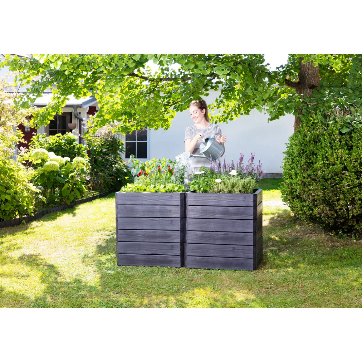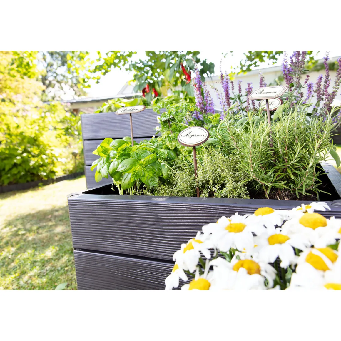 Erleben Sie mit dem Garantia Hochbeet-System Ergo Quadro anthrazit Größe M eine neue Art des Gärtnerns. Das rechteckige Hochbeet in Holzoptik ist aus robustem Recycling-Kunststoff gefertigt und bietet Platz für 110 l Erde. Mit einer Größe von 60x25x80 cm eignet es sich perfekt für den Einsatz im Garten.