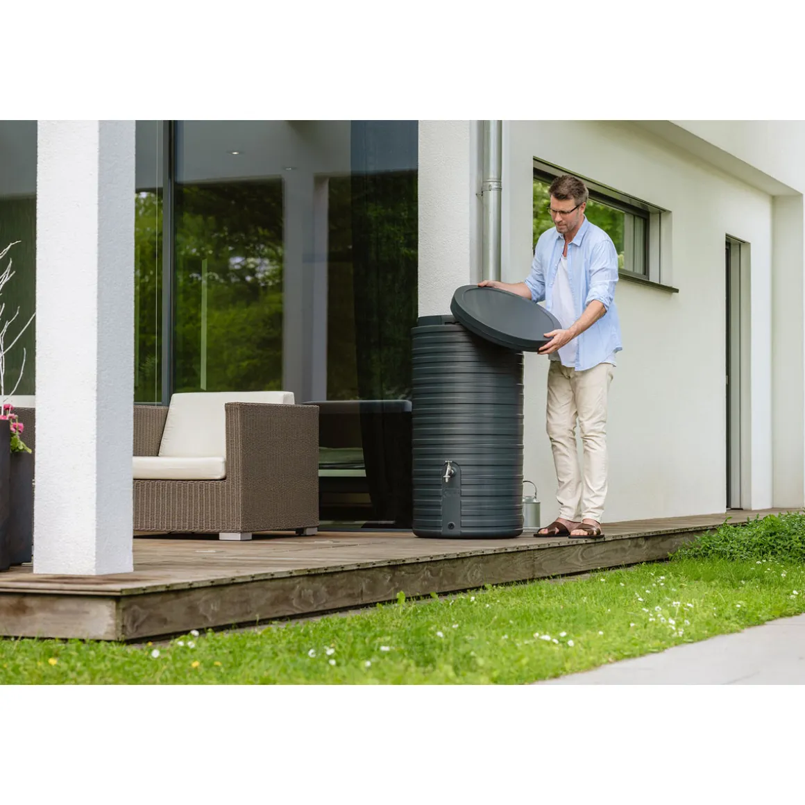 Garantia Regentonne Nordic graphite grey – stilvoll und zeitlos. Dieser Regentonne überzeugt in Ihrem Garten durch sein nordisch schlichtes Design mit 3D-Dekor und seine moderne Farbgebung in einem dunklen Grau. Die kompakten Abmessungen lassen die Regentonne elegant und dekorativ in Ihre Gartengestaltung einfließen. Diese Regentonne aus der Garantia Classic Line bietet Ihnen neben der Möglichkeit 300 Liter kostenloses Regenwasser zu sammeln und Ihren Garten damit nachhaltig zu bewässern, auch eine einfache und schnelle Wasserentnahme über den abnehmbaren Deckel mit integrierter Kindersicherung. Zusätzlich verfügt der Behälter über zwei integrierte Gewindeanschlüsse 19 mm (3/4“) für die Montage des Auslaufhahns (optionales Zubehör), eines Schlauchsets (optionales Zubehör) oder zur Restentleerung vor der Frostperiode. Ihr Regenwasserbehälter ist Witterungseinflüssen und starken Temperaturschwankungen ausgesetzt. Auf diese Bedingungen abgestimmte Materialien sorgen für eine lang anhaltend gute Optik. Darüber hinaus ist der Behälter für eine lange Lebensdauer im Freien vor Sonneneinstrahlung geschützt. Die Einwirkung des UV-Lichts wird auf ein Minimum reduziert. Bereits bei der Entwicklung eines Garantia Produkts wird sehr viel Wert auf ein nachhaltiges Produktdesign gelegt. Die Herstellung erfolgt auf modernsten Produktionsanlagen. Dies sorgt auf Dauer für weniger Umweltbelastung. Dieser Regenwasserbehälter wird aus Recyclingkunststoff hergestellt und ist zu 100 % recycelbar. Qualität Made in Germany. Behälter muss bei Frostgefahr im Winter vollständig entleert werden. Hinweis: Auslaufhahn und Fallrohranschluss nicht im Lieferumfang enthalten.