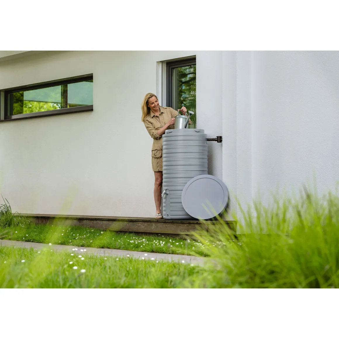 Garantia Regentonne Nordic steingrau – stilvoll und zeitlos. Dieser Regentonne überzeugt in Ihrem Garten durch sein nordisch schlichtes Design mit 3D-Dekor und seine moderne Farbgebung in einem hellen Grau. Die kompakten Abmessungen lassen die Regentonne elegant und dekorativ in Ihre Gartengestaltung einfließen. Diese Regentonne aus der Garantia Classic Line bietet Ihnen neben der Möglichkeit 300 Liter kostenloses Regenwasser zu sammeln und Ihren Garten damit nachhaltig zu bewässern, auch eine einfache und schnelle Wasserentnahme über den abnehmbaren Deckel mit integrierter Kindersicherung. Zusätzlich verfügt der Behälter über zwei integrierte Gewindeanschlüsse 19 mm (3/4“) für die Montage des Auslaufhahns (optionales Zubehör), eines Schlauchsets (optionales Zubehör) oder zur Restentleerung vor der Frostperiode. Ihr Regenwasserbehälter ist Witterungseinflüssen und starken Temperaturschwankungen ausgesetzt. Auf diese Bedingungen abgestimmte Materialien sorgen für eine lang anhaltend gute Optik. Darüber hinaus ist der Behälter für eine lange Lebensdauer im Freien vor Sonneneinstrahlung geschützt. Die Einwirkung des UV-Lichts wird auf ein Minimum reduziert. Bereits bei der Entwicklung eines Garantia Produkts wird sehr viel Wert auf ein nachhaltiges Produktdesign gelegt. Die Herstellung erfolgt auf modernsten Produktionsanlagen. Dies sorgt auf Dauer für weniger Umweltbelastung. Dieser Regenwasserbehälter wird aus Recyclingkunststoff hergestellt und ist zu 100 % recycelbar. Qualität Made in Germany. Behälter muss bei Frostgefahr im Winter vollständig entleert werden. Hinweis: Auslaufhahn und Fallrohranschluss nicht im Lieferumfang enthalten.