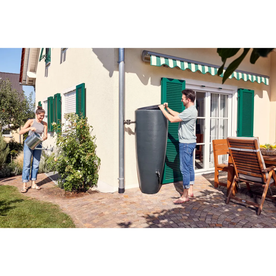Garantia 2in1 Wasserbehälter graphite grey – Doppelfunktion auf moderne Art. Besonders stabiler Deko-Regentonne in klassischem Design und einer Oberflächenstruktur in 3D-Dekor. Das moderne, anthrazitfarbene Design lässt die Regentonne elegant und dekorativ in Ihre Gartengestaltung einfließen. Diese Regentonne aus der Garantia Classic Line bietet Ihnen neben der Möglichkeit 300 Liter kostenloses Regenwasser zu sammeln und Ihren Garten damit nachhaltig zu bewässern, auch die Möglichkeit einer dekorativen Bepflanzung. Hierfür wird eine robuste, herausnehmbare Pflanzschale mit einer Tiefe von 20 Zentimetern, sowie ein Pflanzvlies mitgeliefert. Der Behälter verfügt außerdem über zwei integrierte Gewindeanschlüsse 19 mm (3/4“) für die Montage des Auslaufhahns (optionales Zubehör), eines Schlauchsets (optionales Zubehör) oder zur Restentleerung vor der Frostperiode. Ihr Regenwasserbehälter ist Witterungseinflüssen und starken Temperaturschwankungen ausgesetzt. Auf diese Bedingungen abgestimmte Materialien sorgen für eine lang anhaltend gute Optik. Darüber hinaus ist der Behälter für eine lange Lebensdauer im Freien vor Sonneneinstrahlung geschützt. Die Einwirkung des UV-Lichts wird auf ein Minimum reduziert. Bereits bei der Entwicklung eines Garantia Produkts wird sehr viel Wert auf ein nachhaltiges Produktdesign gelegt. Die Herstellung erfolgt auf modernsten Produktionsanlagen. Dies sorgt auf Dauer für weniger Umweltbelastung. Dieser Regenwasserbehälter wird aus Recyclingkunststoff hergestellt und ist zu 100 % recycelbar. Qualität Made in Germany. Behälter muss bei Frostgefahr im Winter vollständig entleert werden. Hinweis: Auslaufhahn, Dekoration und Fallrohranschluss nicht im Lieferumfang enthalten.