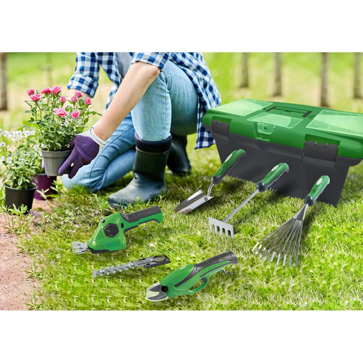Mit der Gartenbox haben Sie alles, was Sie für die Pflege Ihres Gartens benötigen. Die Box enthält eine Akku-Astschere, eine Akku-Gras- und Strauchschere sowie zwei Rechen und eine Blumenkelle.
