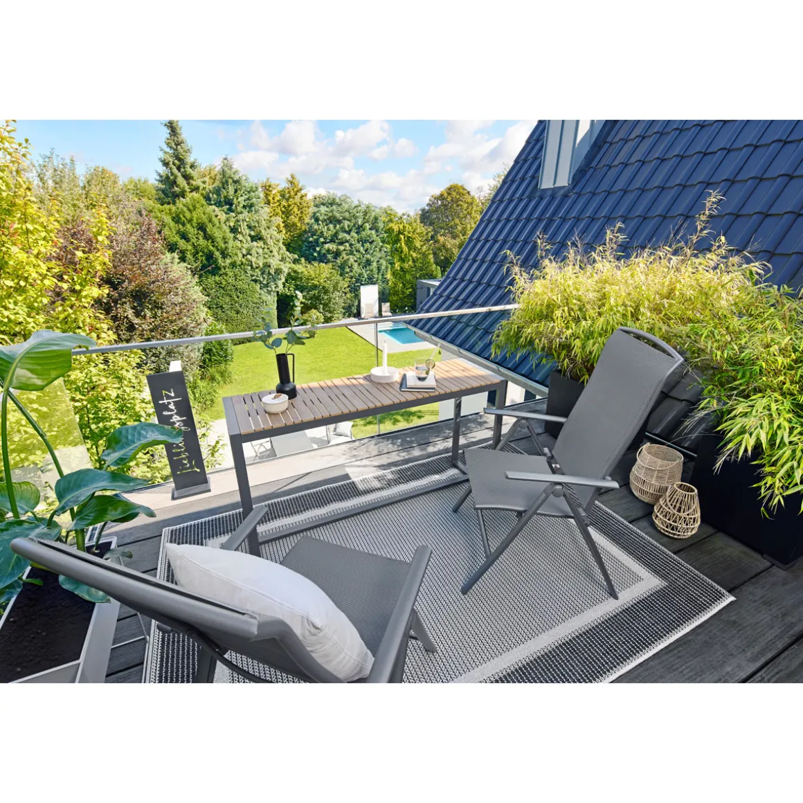 - Pulverbeschichtetes Aluminiumgestell sorgt für Stabilität und Langlebigkeit
