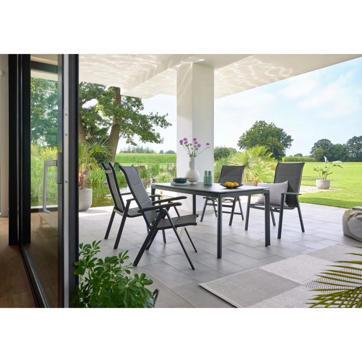 - Pulverbeschichtetes Aluminiumgestell in Grau bietet Stabilität und Schutz vor Witterungseinflüssen