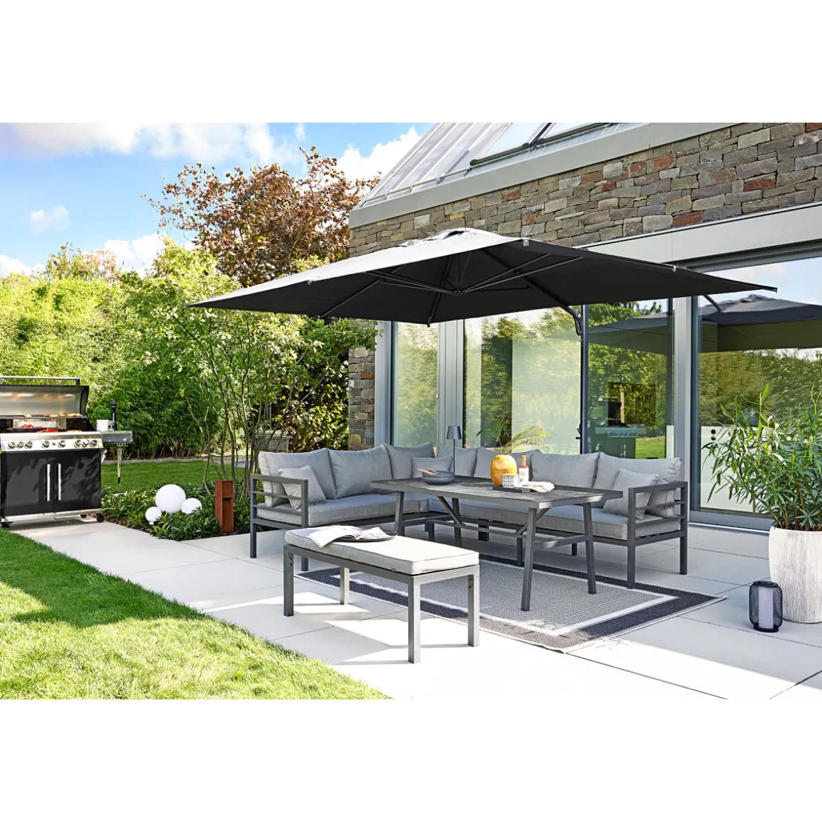 Mit der Haveson Loungegarnitur Göteborg holen Sie sich ein hochwertiges Loungemöbel-Set auf Ihre Terrasse. Die Grundfarbe in Grau und das pulverbeschichtete Aluminiumgestell in Anthrazit verleihen dem Set eine moderne Optik. Doch nicht nur das Aussehen überzeugt, auch die verstellbare Liegefunktion sorgt für höchsten Komfort.