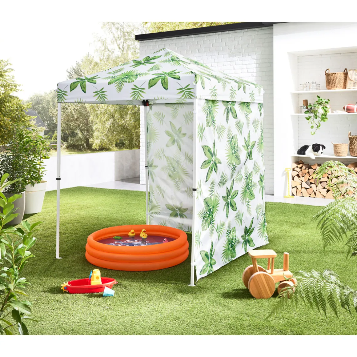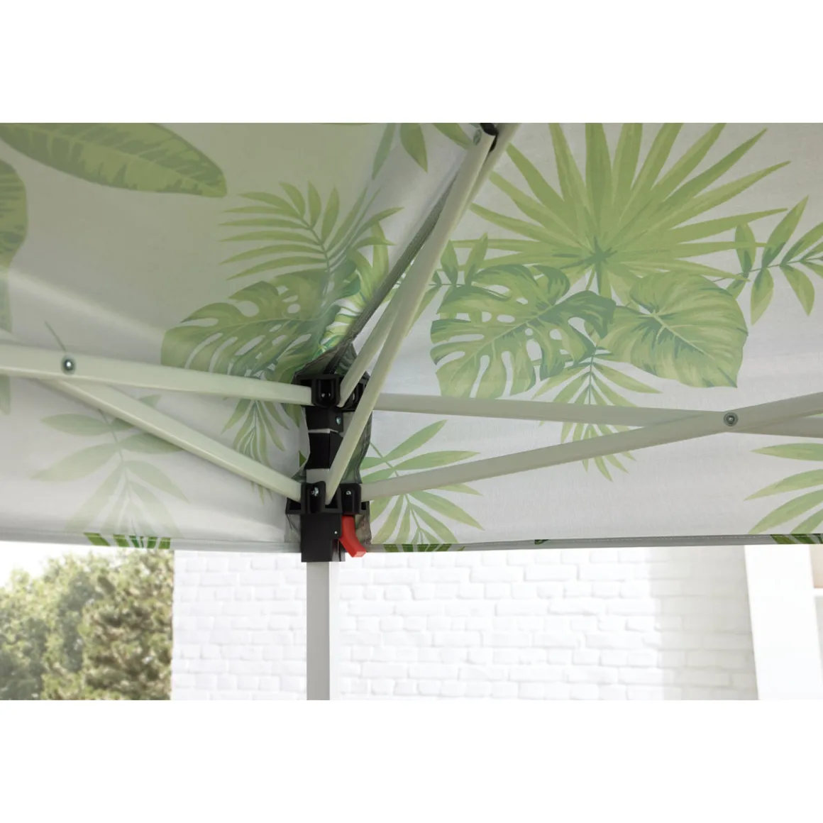 Genießen Sie den Sommer im Schatten des Haveson Push-Up Mini-Faltpavillons PALM LEAF mit seinem stilvollen grünen Dekor.