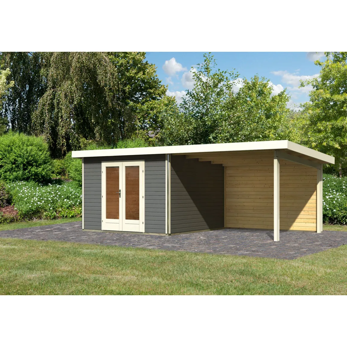 Karibu Blockbohlenhaus Radeburg 1 terragrau mit Anbaudach und Rückwand