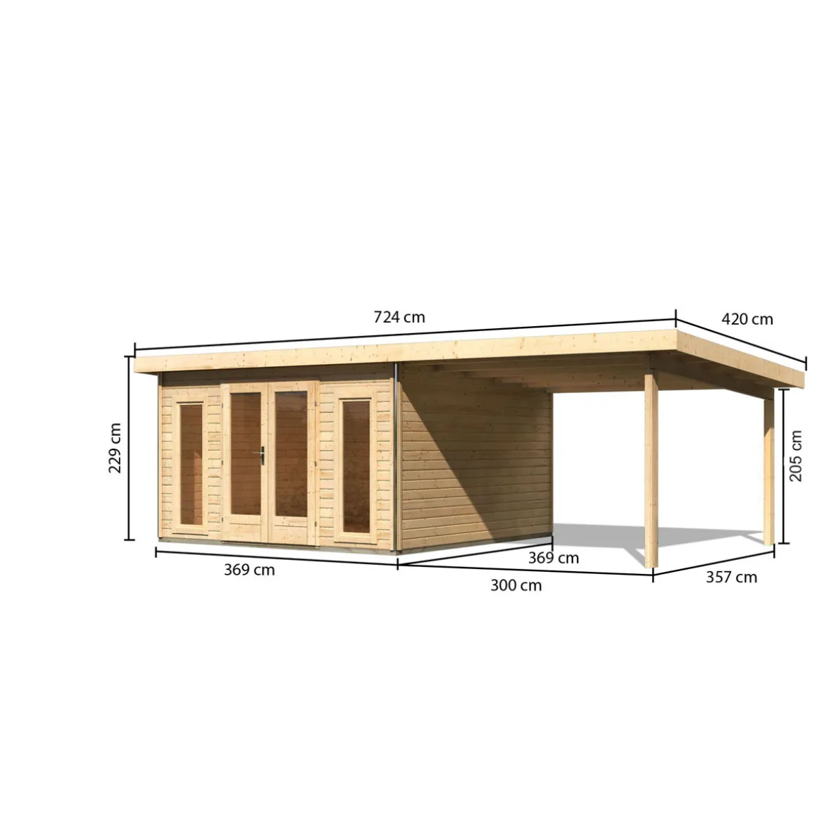 Das Gartenhaus wird aus 38 mm starken Wandbrettern aus nordischer Fichte im Steck-/Schraubsystem gefertigt und gewährleistet somit einen einfachen Aufbau und eine extrem stabile Konstruktion mit doppeltem Nut- und Federbereich der Wandbretter. Das Pultdach besteht aus Massivholzdach. Der vordere Dachüberstand von 205 mm schützt den Eingangsbereich darüber hinaus wirkungsvoll. Die Grundfläche beträgt 13,32 m² bei einem umbauten Raum von 27,7 m³. Mit einer Seitenhöhe von 201 cm und einer Firsthöhe von 229,5 cm bietet das Gartenhaus optimale Raumnutzung. Das Gartenhaus ohne Anbauten hat ein Sockelmaß von 365×365 cm. Bodenbalken sorgen für den Schutz von unten und werden unter das Gartenhaus gelegt. Durch die Kesseldruckimprägnierung der Bodenbalken sind diese vor Witterungseinflüssen und holzzersetzenden Pilzen bereits geschützt. Die praktische und vormontierte Tür sorgt mit Ihren großzügigen Abmessungen und dem Massivholzrahmen für einen einfachen Zutritt in das Gartenhaus und sichert den Inhalt nebenbei effektiv vor unbefugtem Zugriff. Die Verglasung der Lichtausschnitte sorgt für großzügigen Tageslichteinfall.