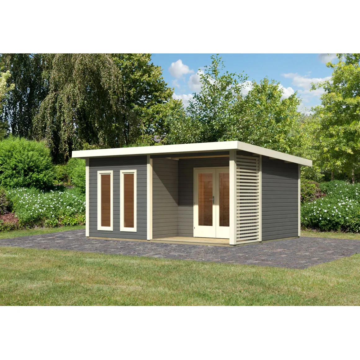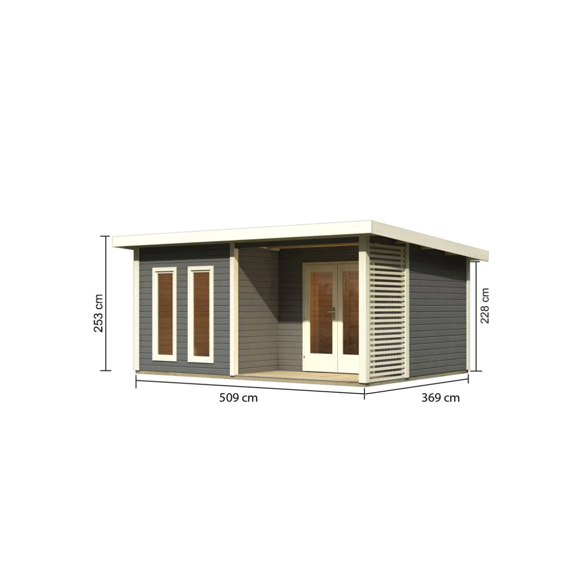 Das Gartenhaus wird aus 38 mm starken Wandbrettern aus nordischer Fichte im Steck-/Schraubsystem gefertigt und gewährleistet somit einen einfachen Aufbau und eine extrem stabile Konstruktion mit doppeltem Nut- und Federbereich der Wandbretter. Das Flachdach besteht aus Massivholzdach. Der vordere Dachüberstand von 276 mm schützt den Eingangsbereich darüber hinaus wirkungsvoll. Die Grundfläche beträgt 19 m² bei einem umbauten Raum von 42 m³. Mit einer Seitenhöhe von 247 cm und einer Firsthöhe von 254 cm bietet das Gartenhaus optimale Raumnutzung. Das Gartenhaus ohne Anbauten hat ein Sockelmaß von 506×366 cm. Bodenbalken sorgen für den Schutz von unten und werden unter das Gartenhaus gelegt. Durch die Kesseldruckimprägnierung der Bodenbalken sind diese vor Witterungseinflüssen und holzzersetzenden Pilzen bereits geschützt. Die praktische und vormontierte Tür sorgt mit Ihren großzügigen Abmessungen und dem Massivholzrahmen für einen einfachen Zutritt in das Gartenhaus und sichert den Inhalt nebenbei effektiv vor unbefugtem Zugriff. Die Verglasung der Lichtausschnitte sorgt für großzügigen Tageslichteinfall.