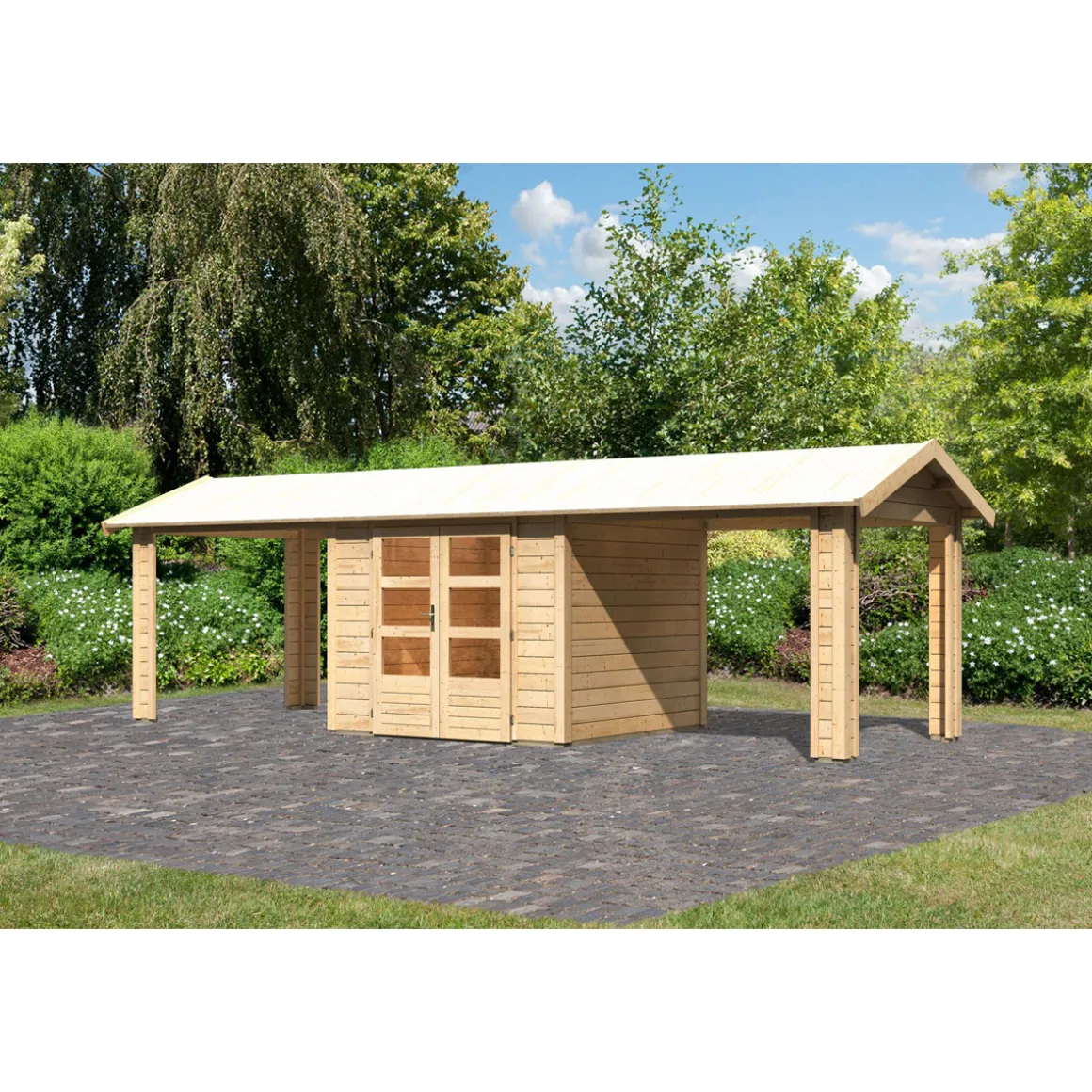 Karibu Blockbohlenhaus Theres 3 naturbelassen mit 2 Dachausbauelementen