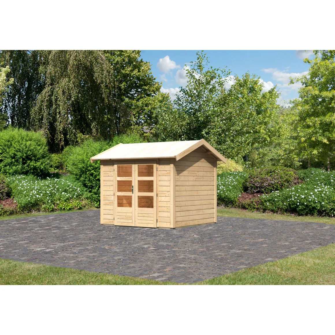 Das Gartenhaus wird aus 28 mm starken Wandbrettern aus nordischer Fichte im Steck-/Schraubsystem gefertigt und gewährleistet somit einen einfachen Aufbau und eine stabile Konstruktion. Das Satteldach besteht aus Massivholzdach. Die Grundfläche beträgt 5,5 m² bei einem umbauten Raum von 12,2 m³. Mit einer Seitenhöhe von 204 cm und einer Firsthöhe von 242 cm bietet das Gartenhaus optimale Raumnutzung. Das Gartenhaus ohne Anbauten hat ein Sockelmaß von 240×244 cm. Bodenbalken sorgen für den Schutz von unten und werden unter das Gartenhaus gelegt. Durch die Kesseldruckimprägnierung der Bodenbalken sind diese vor Witterungseinflüssen und holzzersetzenden Pilzen bereits geschützt. Die praktische und vormontierte Tür sorgt mit Ihren großzügigen Abmessungen und dem Massivholzrahmen für einen einfachen Zutritt in das Gartenhaus und sichert den Inhalt nebenbei effektiv vor unbefugtem Zugriff. Die Verglasung der Lichtausschnitte sorgt für großzügigen Tageslichteinfall.