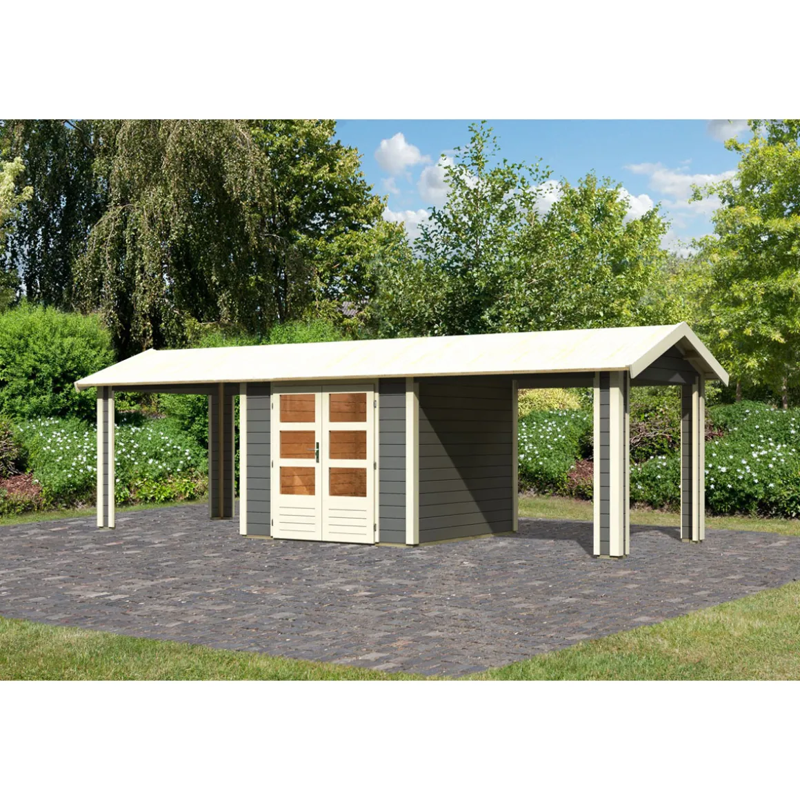 Karibu Blockbohlenhaus Theres 3 terragrau mit 2 Dachausbauelementen