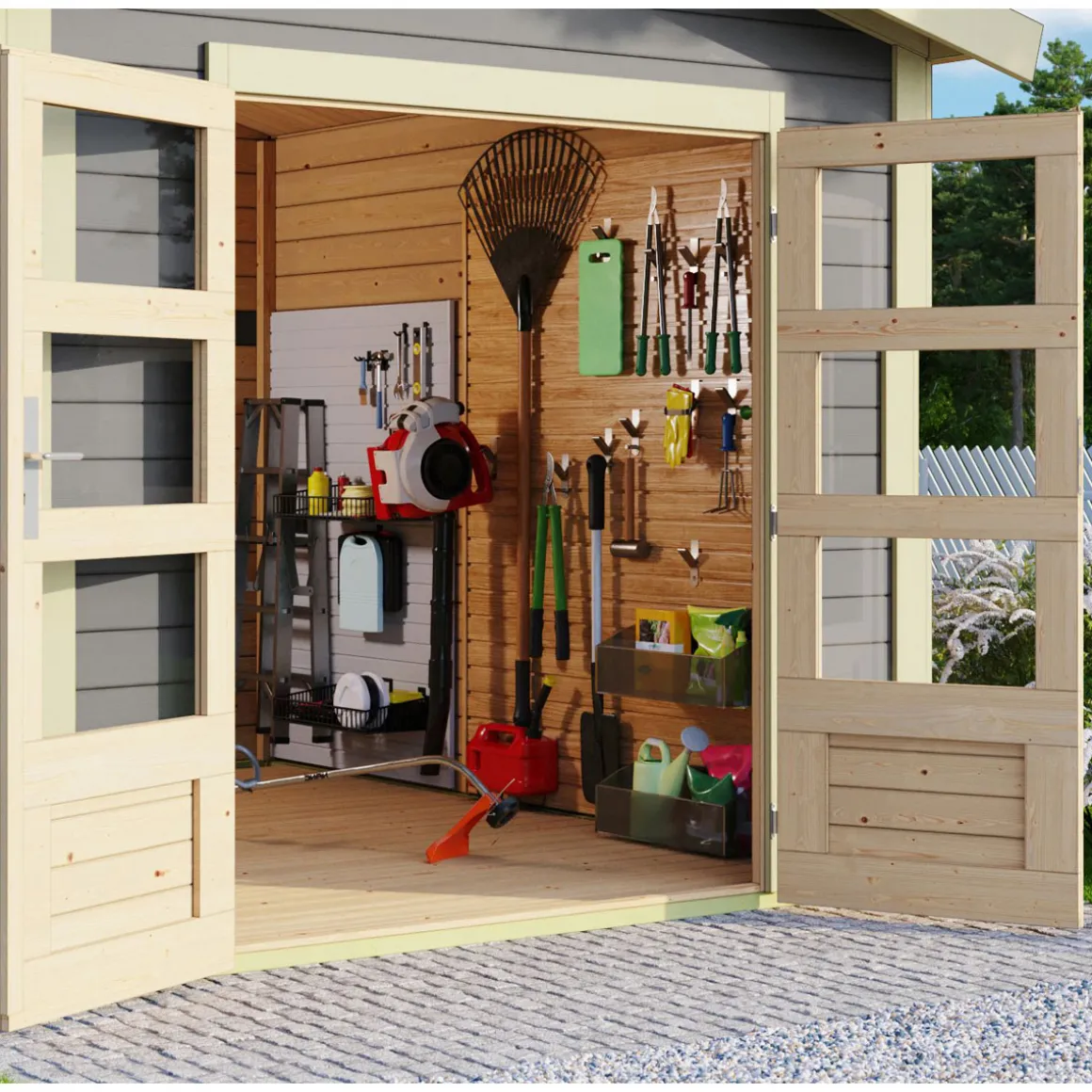 Das Gartenhaus wird aus 28 mm starken Wandbrettern aus nordischer Fichte im Steck-/Schraubsystem gefertigt und gewährleistet somit einen einfachen Aufbau und eine stabile Konstruktion. Das Satteldach besteht aus Massivholzdach. Die Grundfläche beträgt 5,5 m² bei einem umbauten Raum von 12,2 m³. Mit einer Seitenhöhe von 204 cm und einer Firsthöhe von 242 cm bietet das Gartenhaus optimale Raumnutzung. Das Gartenhaus ohne Anbauten hat ein Sockelmaß von 240×244 cm. Bodenbalken sorgen für den Schutz von unten und werden unter das Gartenhaus gelegt. Durch die Kesseldruckimprägnierung der Bodenbalken sind diese vor Witterungseinflüssen und holzzersetzenden Pilzen bereits geschützt. Die praktische und vormontierte Tür sorgt mit Ihren großzügigen Abmessungen und dem Massivholzrahmen für einen einfachen Zutritt in das Gartenhaus und sichert den Inhalt nebenbei effektiv vor unbefugtem Zugriff. Die Verglasung der Lichtausschnitte sorgt für großzügigen Tageslichteinfall.