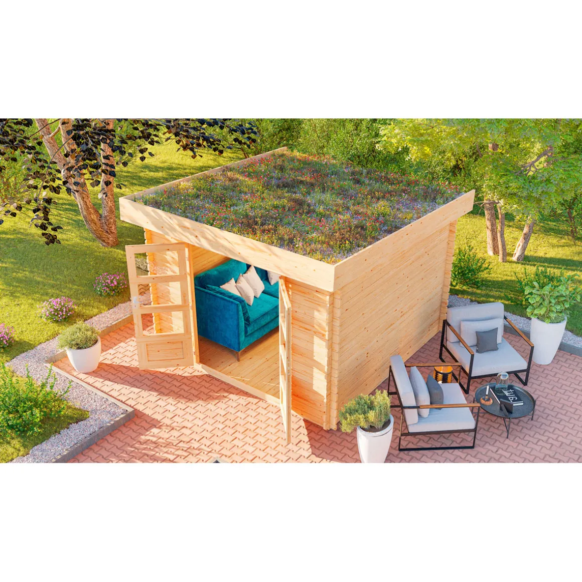 Pultdach, nordische Fichte, naturbelassen, Wandstärke 28 mm, erhöhte Schneelast von 300 kg/m2 (bei Bepflanzung 125 kg/m2), Bepflanzung der Dachfläche dient als Schallschutz und bindet CO2, auch in Anthrazit erhältlich.