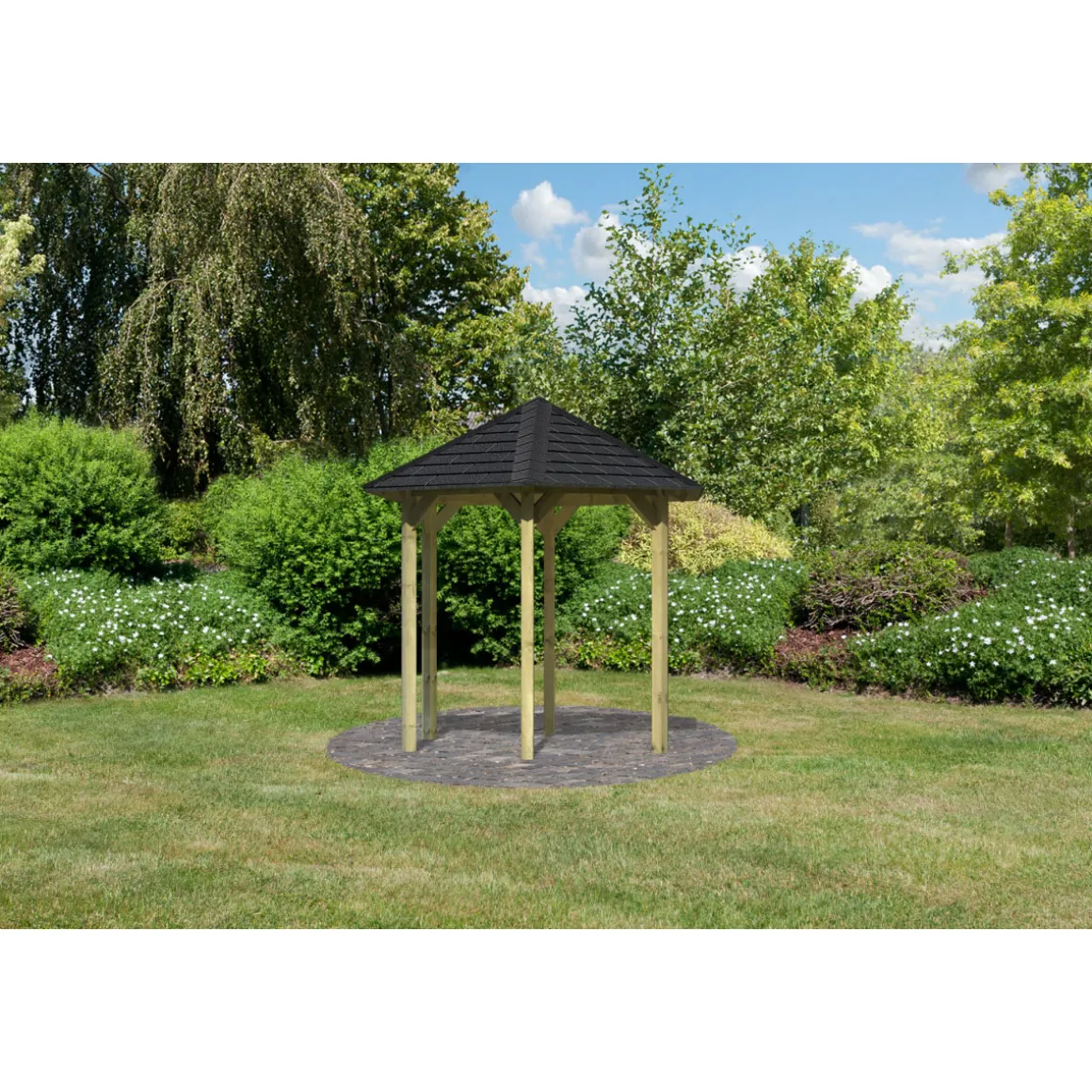 Dieser kesseldruckimprägnierte 6 Eck Pavillon findet selbst im kleinsten Garten Platz.Pavillon Eco Serie, 9 x 9 mm starke Pfosten aus kesseldruckimprägniertem Massivholz, 16 mm starke Dachplatten naturbelassen. Inkl. Montageanleitung, Dachpappe und Beschlägen.