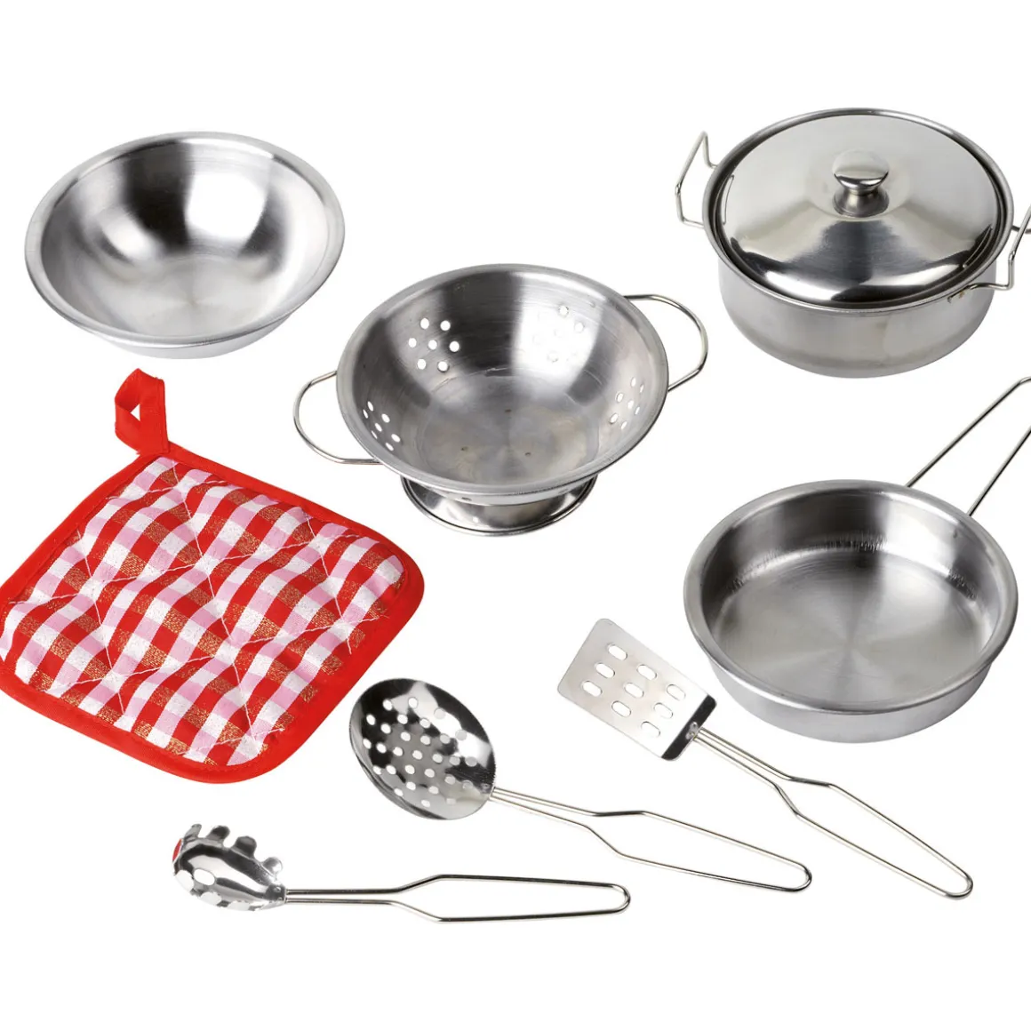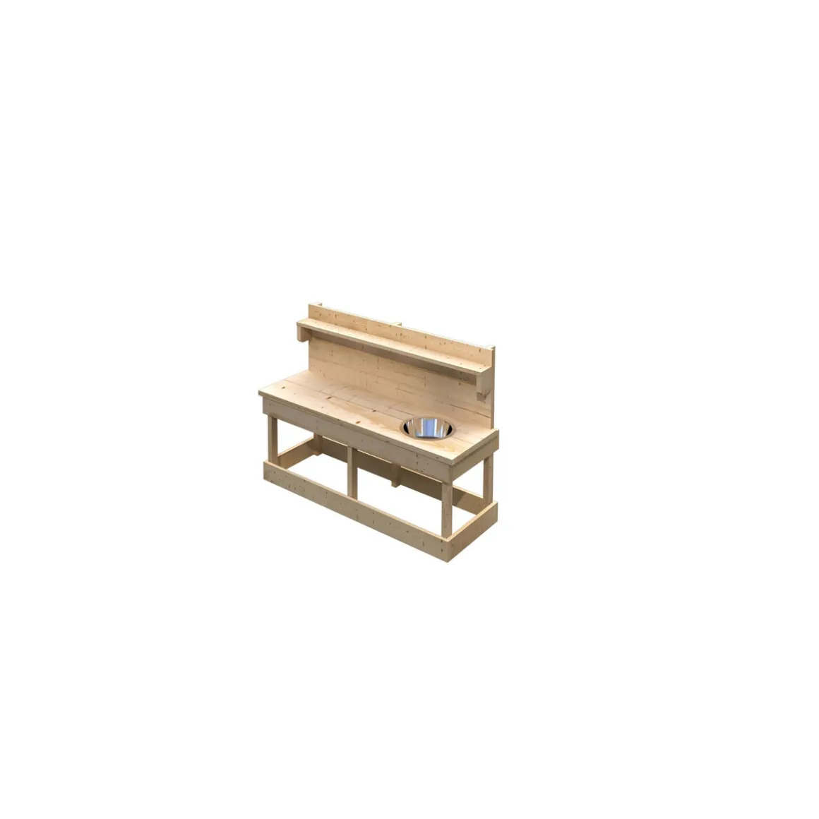 - Ausstattung: Edelstahltbecken für Wasser, Topfset, 6 Haken Ablage oben und unten für Spielsachen