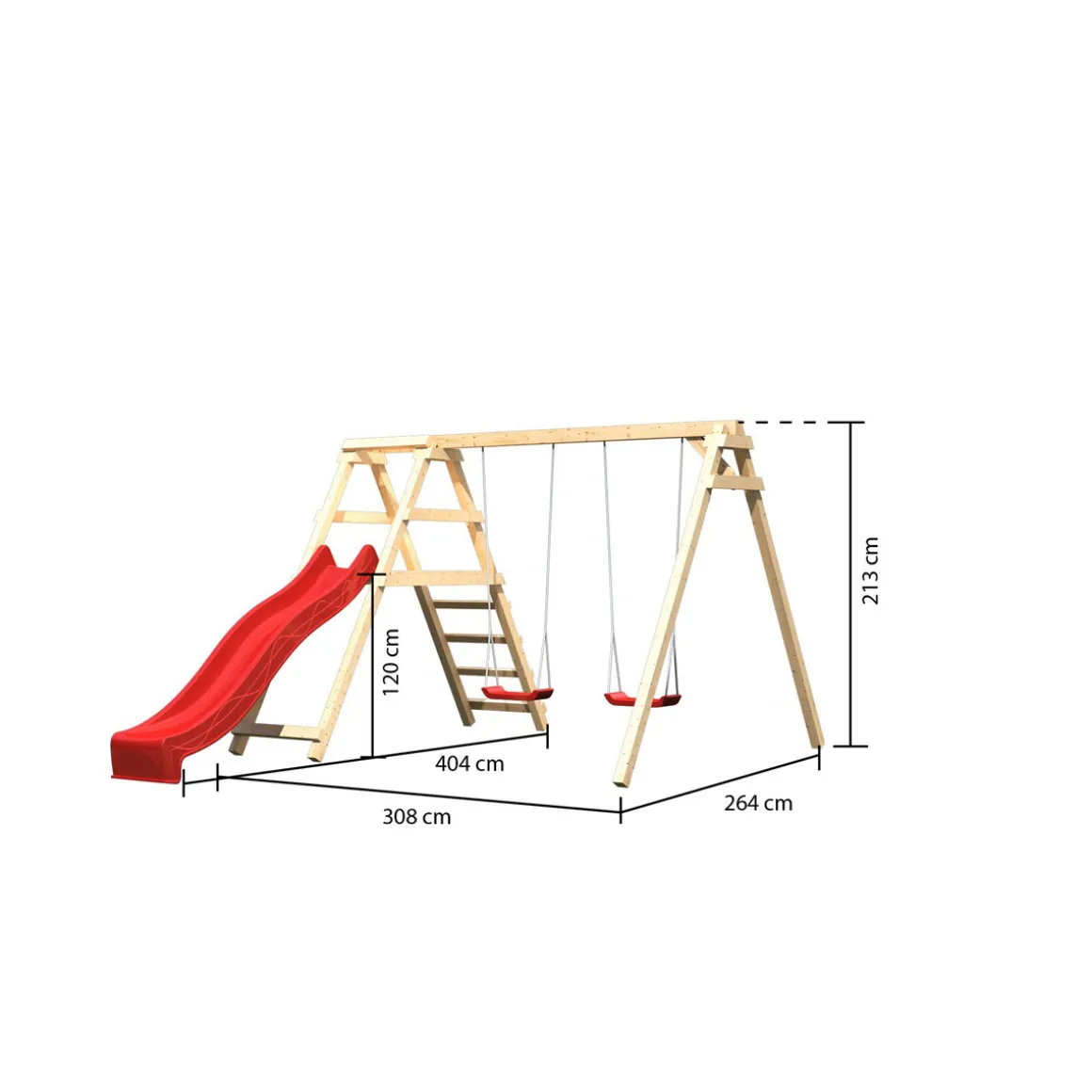 Das Karibu Schaukelset mit Klettergerüst in naturbelassener Optik inklusive roter Rutsche bietet Kindern eine Menge Spaß im eigenen Garten. Die hochwertige Verarbeitung aus Fichtenholz sorgt dabei für Stabilität und Sicherheit beim Spielen. Mit einer Maximalbelastbarkeit von je bis zu 70 kg pro Sitz können auch ältere Kinder noch bedenkenlos schaukeln oder klettern. Eine Montageanleitung sowie alle benötigten Materialien wie Nägel, Haken oder auch die beiden Brettschaukeln sind im Lieferumfang enthalten.
