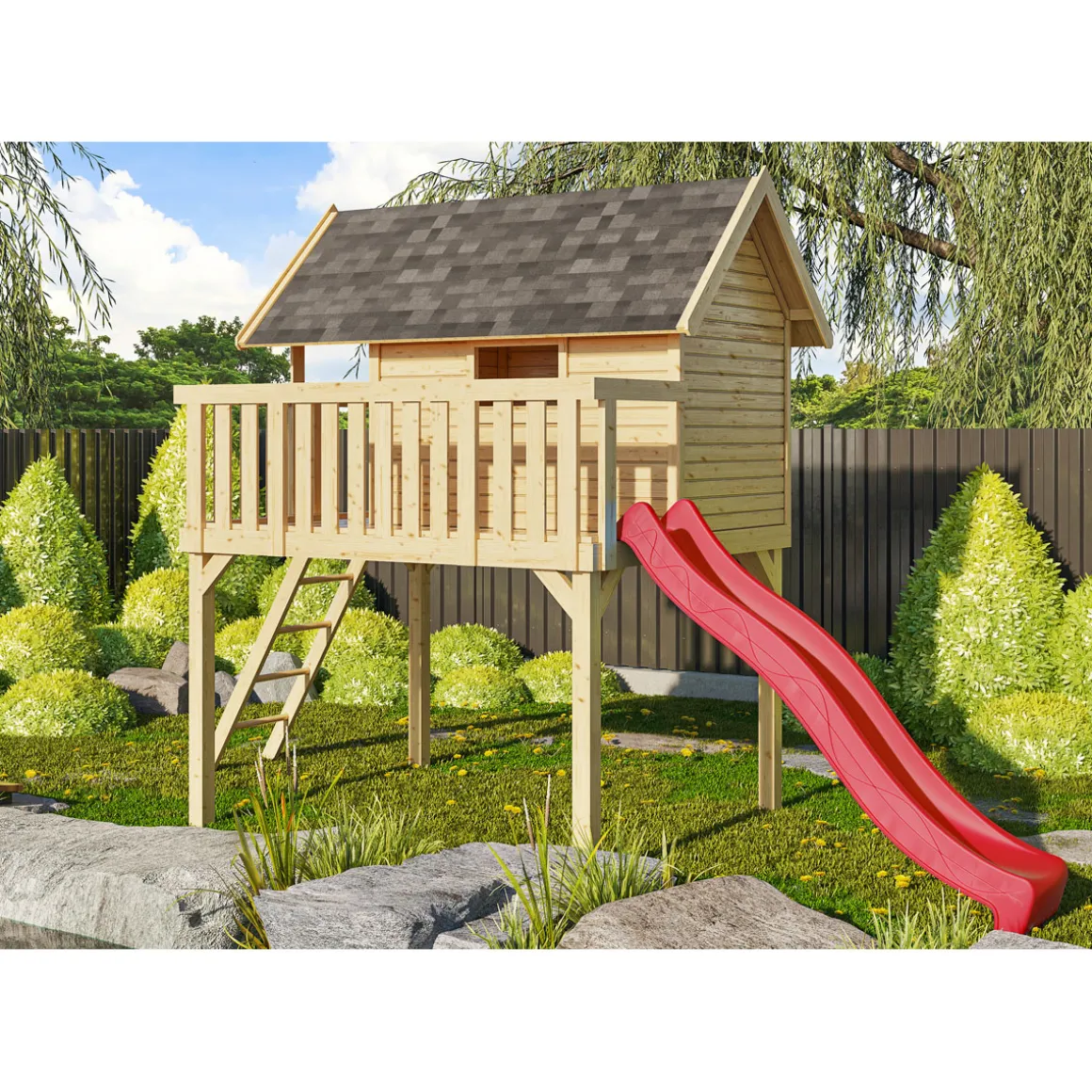 Das Spielhaus „Fidel“ aus nordischer Fichte hat 9 x 9 cm starke Pfosten welche Auflage für das Satteldach aus Massivholz mit einer Dachfläche von 5,9 qm. Die Befestigung erfolgt über ein Steck- und Schraubsystem.