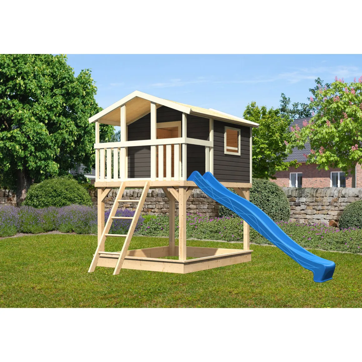 Karibu Stelzenhaus Benjamin terragrau inkl Rutsche blau