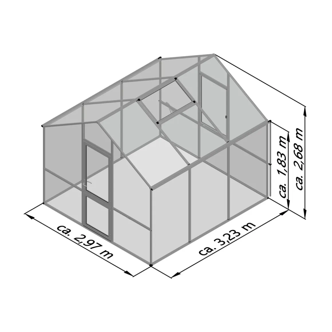 - Türmaß (BxH): 76×204 cm; Traufhöhe: 183 cm; Firsthöhe: 268 cm; Grundflächeform: rechteckig; Grundfläche: 9,6 m²