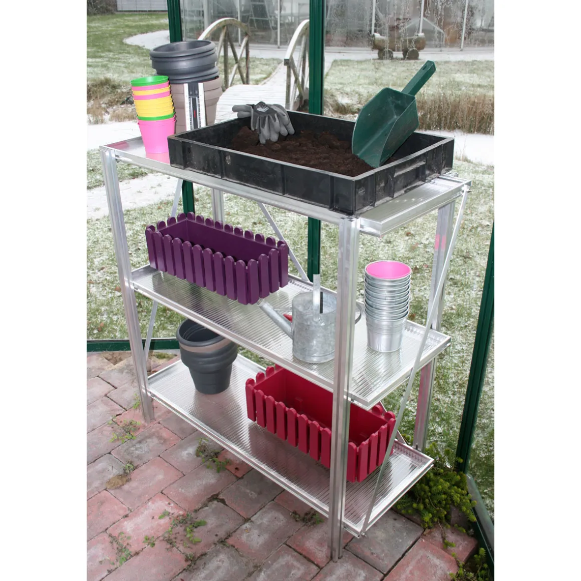 Das KGT Universal Regalsystem ist die ideale Lösung für alle, die in ihrem Gewächshaus mehr Stauraum benötigen. Mit drei Arbeitsplatten aus Kunststoff und einer Grundfläche von 0,385 m² bietet es genug Platz für Ihre Pflanzen und Gartengeräte.