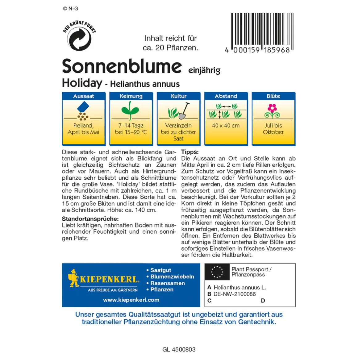 Die Kiepenkerl Sonnenblume Holiday ist eine ideale Wahl für alle, die ihren Garten oder Balkon mit einer farbenfrohen und pflegeleichten Blumenmischung aufwerten möchten. Durch ihre gelben Blüten bringt sie nicht nur optische Highlights in jede Umgebung sondern bietet durch ihre Nahrungsquelle auch einen wichtigen Beitrag zum Erhalt unserer Bienen und Nützlinge.