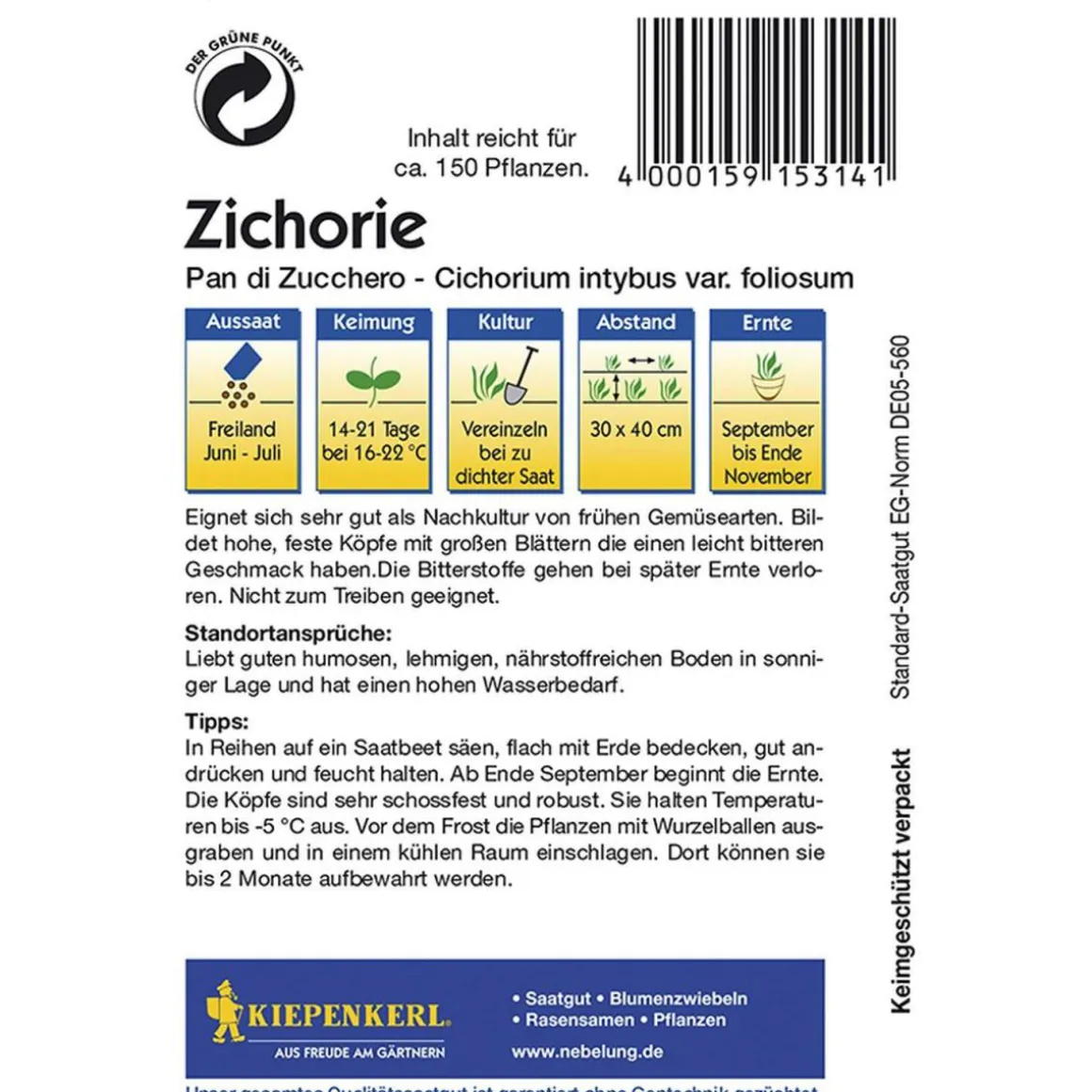 - Hinweise zur Aussaat: Auf Pflanzabstand achten; Aussaatzeit Vorkultur ca. März, April, Mai; Direktsaat Juni bis Juli;