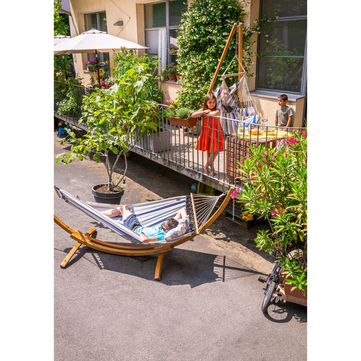 Entspannen Sie sich in der La Siesta Doppel-Stabhängematte Alisio Sea Salt und genießen Sie das schöne Wetter im Freien.