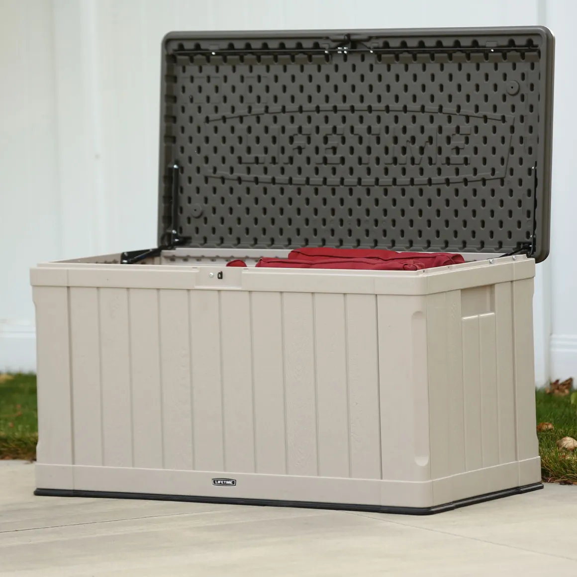 Die bessere Kissentruhe: unverwüstlich, wetterfest, 440l Stauraum. Diese extrem stabile Truhe aus Polyethylen-Kunststoff ist aufwändig in Wabentechnik gebaut. Durch die doppelwandige, 26 mm starke Konstruktion sind sowohl Wände als auch Deckel stabil versteift. So ist diese Truhe mit bis zu 300 kg belastbar! Perfekt auch als Anrichte für Ihr Büffet — und sogar als Sitzbank. Packt ca. 440l (statt üblicher 300-400 l). Kissen, Gartenutensilien, Spielsachen, Pool-Zubehör, … sind in der ganzjährig outdoor-tauglichen Truhe perfekt verstaut. Der Inhalt wird sauber und trocken gelagert. Nichts kann schimmeln, verschmutzen oder Stockflecken bilden. Gasdruckdämpfer halten den Deckel aufrecht. Der geöffnete Deckel bleibt im Winkel von 90° stehen und kann bequem heruntergedrückt werden. So ist die Truhe viel komfortabler zu öffnen und zu bestücken. In universell kombinierbarem Grau-Ton. Mit Vorhängeschloss-Vorrichtung. Wasserabweisend, 100 % UV-beständig, farbtreu und pflegeleicht abwaschbar.