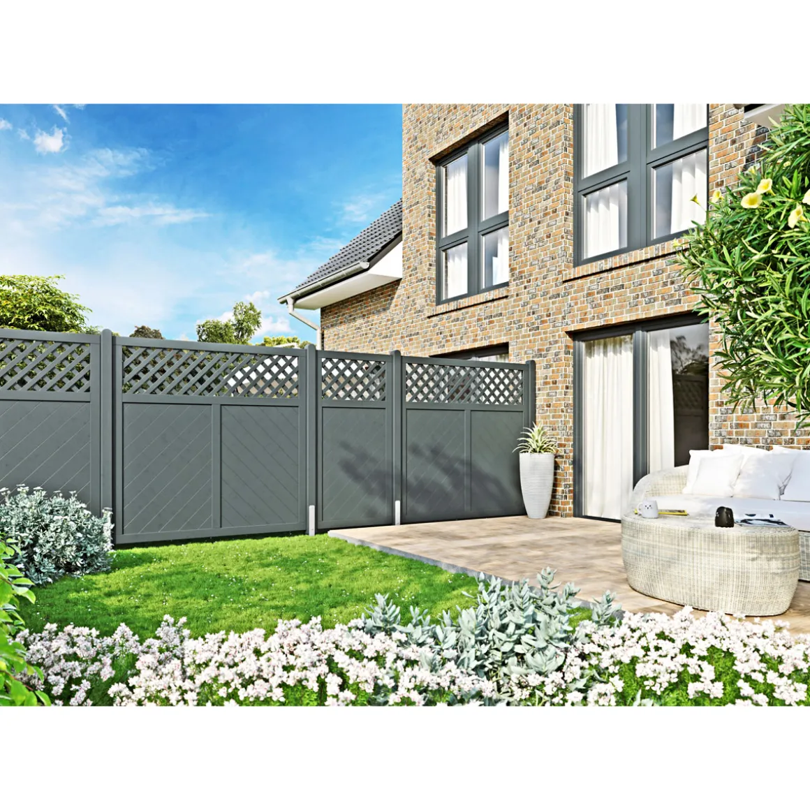 - Grundfarbe Grau verleiht dem Zaunelement eine zeitlose Optik passend zu jedem Stil