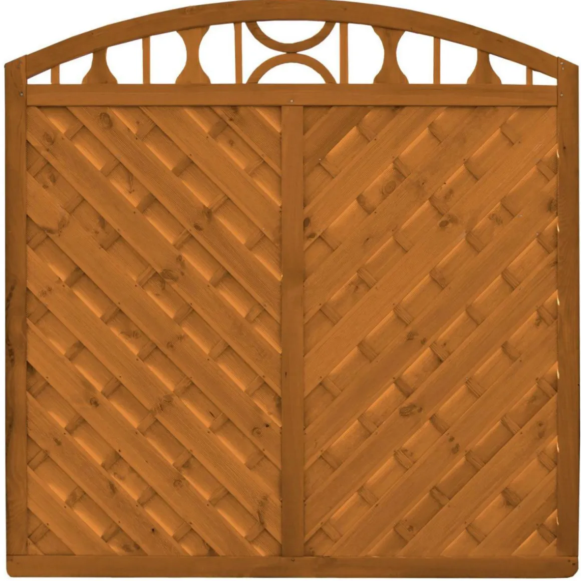 Ornamentzaun m. Leimholzbogen 180×180, honig geölt, aus Kiefernholz, FSC MIX Zerifikat- Holz aus verantwortungsvollen Quellen