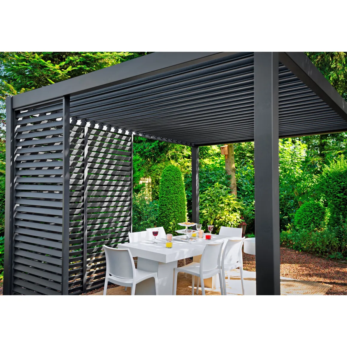 Genießen Sie das ganze Jahr über die Natur mit dieser Aluminium-Pergola mit Lamellendach! Die Pergola besteht aus hochwertigem Aluminium und ist so konzipiert, dass sie dauerhaften Schutz vor verschiedenen Wetterbedingungen bietet. Bei Regenwetter halten Sie die geschlossenen Lamellen schön trocken. Das Regenwasser wird kontrolliert über die Masten abgeleitet. Darüber hinaus sorgt das Lamellendach dafür, dass Sie auch an den heißesten Tagen des Jahres immer das richtige Maß an Sonne und Schatten haben. Neben ihrer praktischen Anwendung hat die Pergola auch ein schönes und luxuriöses Aussehen. Dank ihres modernen und minimalistischen Designs ist diese Pergola ein echter Hingucker in Ihrem Garten. Darüber hinaus besteht auch die Möglichkeit, optional weiteres Zubehör hinzuzufügen, wie zum Beispiel: eine Seitenwand oder Aluminium-Lamellenpaneele. Dadurch können Sie die Pergola ganz nach Ihren Wünschen gestalten. Dank der klaren Anleitung und dem Anleitungsvideo ist die Pergola einfach zu installieren. Wir empfehlen, die Pergola auf einem festen, harten Untergrund zu montieren. Zum Beispiel durch das Setzen von Betonfundamenten.