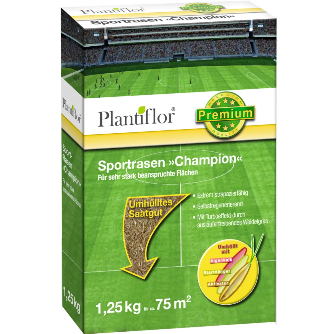 Mit dem Plantiflor Sportrasen Champion erhalten Sie einen hochwertigen Rasensamen, der speziell für sehr stark beanspruchte Flächen geeignet ist. Mit einer Gebindegröße von 1,25 kg und einem Gewicht pro Stück von 1,25 kg eignet sich dieser Artikel ideal für die Neuanlage Ihres Rasens.