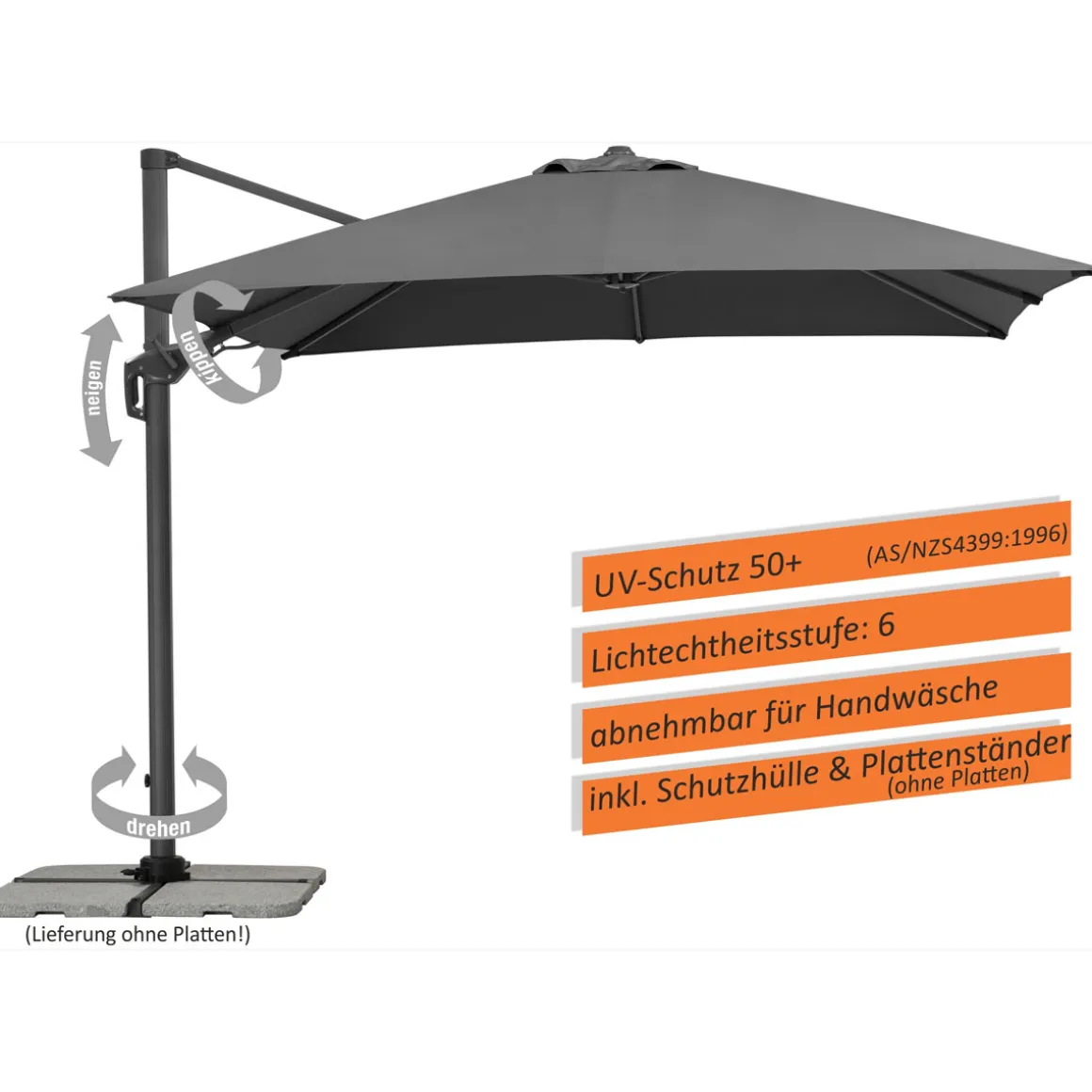 Dieser Ampelschirm eignet sich perfekt für alle Kunden, die eine große Terrasse oder einen Garten haben und auf der Suche nach einem hochwertigen Sonnenschutz sind. Durch seine Größe bietet er ausreichend Platz für mehrere Personen und schützt zuverlässig vor UV-Strahlen.