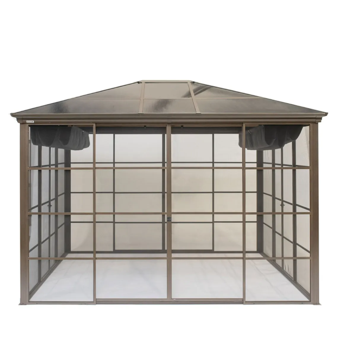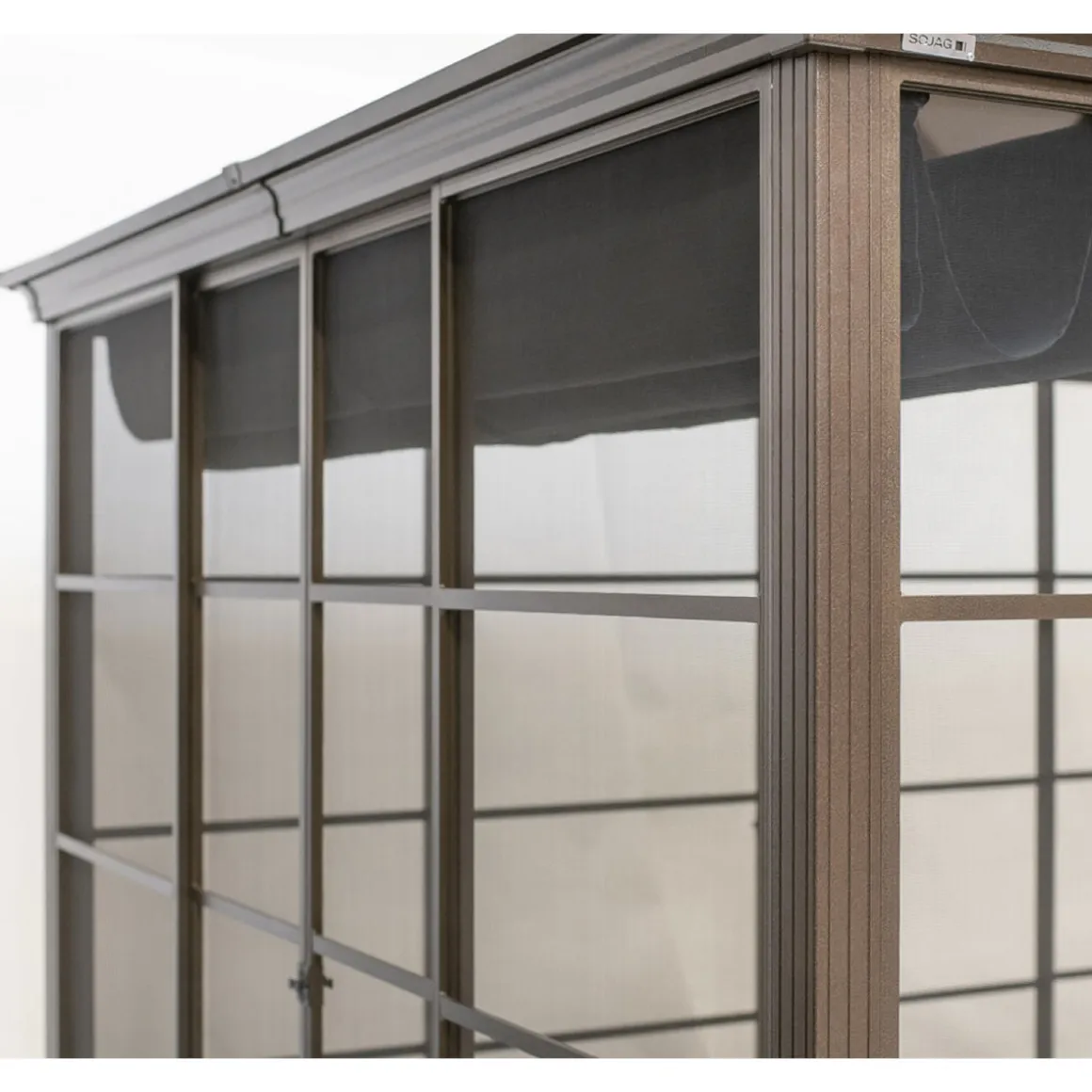 SOJAG Aluminium Pavillon Castel 10×12 mit Hard-Top Modern, langlebig und eine tolle Optik sind Merkmale für die neuen Aluminiumpavillons vom größten und bekanntesten kanadischen Pavillon Produzenten SOJAG. Außergewöhnliche 125kg/m² Schneelast und alle Aluminiumteile dauerhaft rostfrei! Das Dach besteht aus 8mm starken Doppelsteglatten, ist wasserdicht und hält Witterungen wie Regen, Schnee oder Sonne (UV) problemlos Stand. Das gleiche gilt für die massive Konstruktion aus resistentem, pulverbeschichtetem Aluminium(Pfostenstärke 7,6cm). Selbst die Schrauben bestehen aus rostfreiem Edelstahl. Der Pavillon muss daher im Winter nicht abgebaut werden. Der Pavillon ist runterherum mit Alu-verstärkten Moskitonetzen ausgestattet. An allen 4 Seiten befindet sich jeweils eine Doppel-Schiebetür (Öffnungsmaße BxH: schmale Seite 100x210cm, breite Seite 165x210cm). Zum Schutz vor Sonne ist der Pavillon mit einem Raffdach ausgestattet welches mittels Handgriffs beliebig gespannt werden kann. Der Pavillon Castel kommt im edlen Bronze Farbton. Einfacher Aufbau durch 2 Personen mit Hilfe von handelsüblichen Werkzeugen sowie einer detaillierten Schritt-für-Schritt Anleitung. Aufbauzeit ca. 5-6 Stunden. Die Füße besitzen jeweils 3 Bohrungen, dass heißt, Sie benötigen zur Befestigung am Boden 12 Schrauben und Dübel. Als Untergrund empfehlen wir eine ebene Fläche aus Holz, Beton oder Pflastersteinen. Schraubenkit zur Verankerung am Boden wird nicht mitgeliefert.