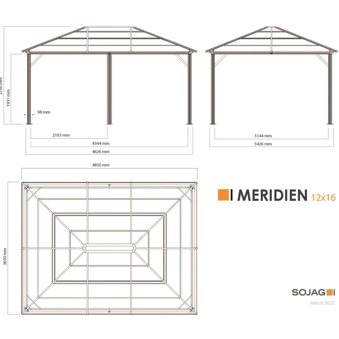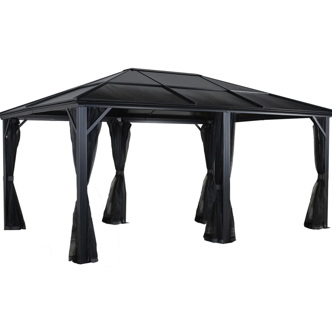 Kanadas Nr. 1 in Pavillons SOJAG Aluminium Pavillon Meridien 12×16 mit HardTop Modern, langlebig und eine tolle Optik sind Merkmale für die neuen Aluminiumpavillons vom größten und bekanntesten kanadischen Pavillon Produzenten SOJAG. Außergewöhnliche 125 kg/m² Schneelast und alle Aluminiumteile dauerhaft rostfrei! Das Dach besteht aus 8mm starken Doppelsteglatten, ist wasserdicht und hält Witterungen wie Regen, Schnee oder Sonne (UV) problemlos Stand. Das gleiche gilt für die massive Konstruktion aus resistentem, pulverbeschichtetem Aluminium (Pfostenstärke 9,8 cm). Selbst die Schrauben bestehen aus rostfreiem Edelstahl. Der Pavillon muss daher im Winter nicht abgebaut werden. Inklusive Moskitonetzen aus Nylon und zweigleisigen Laufschienen zur zusätzlichen Anbringung von Vorhängen (separat als Zubehör erhältlich). Im Gegensatz zu anderen Modellen gilt hier nicht entweder das Eine oder das Andere, sondern hier können sowohl Moskitonetze (bereits inbegriffen) und gleichzeitig Vorhänge genutzt werden. Der Pavillon Meridien kommt in edlen Anthrazit Farbton. Optisch passende Vorhänge (Dunkelgrau) separat erhältlich. Einfacher Aufbau durch 2 Personen mit Hilfe von handelsüblichen Werkzeugen sowie einer detaillierten Schritt-für-Schritt Anleitung. Aufbauzeit ca. 4-5 Stunden. Die Füße besitzen jeweils 3 Bohrungen, dass heißt, Sie benötigen zur Befestigung am Boden 18 Schrauben und Dübel. Als Untergrund empfehlen wir eine ebene Fläche aus Holz, Beton oder Pflastersteinen. Schraubenkit zur Verankerung am Boden wird nicht mitgeliefert.