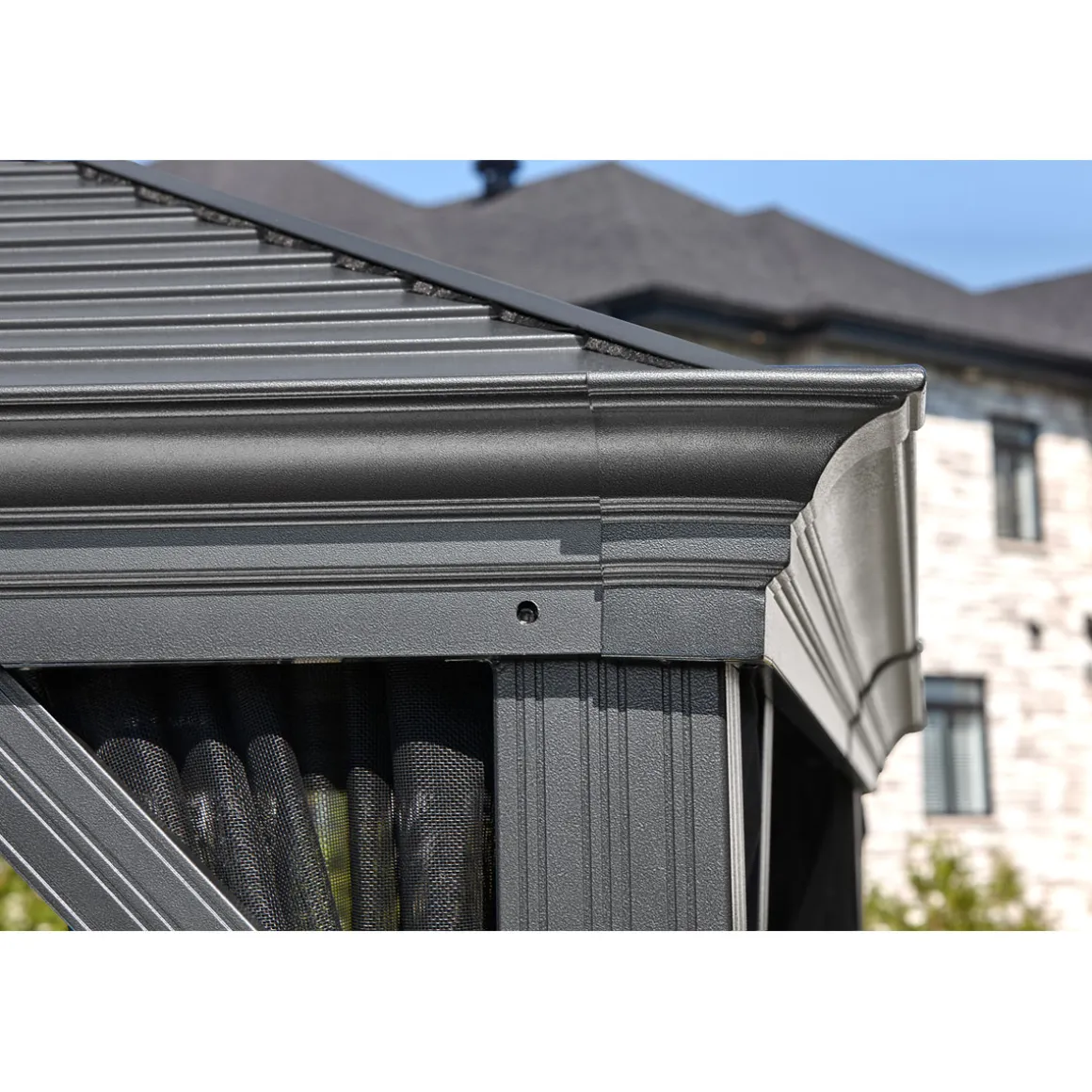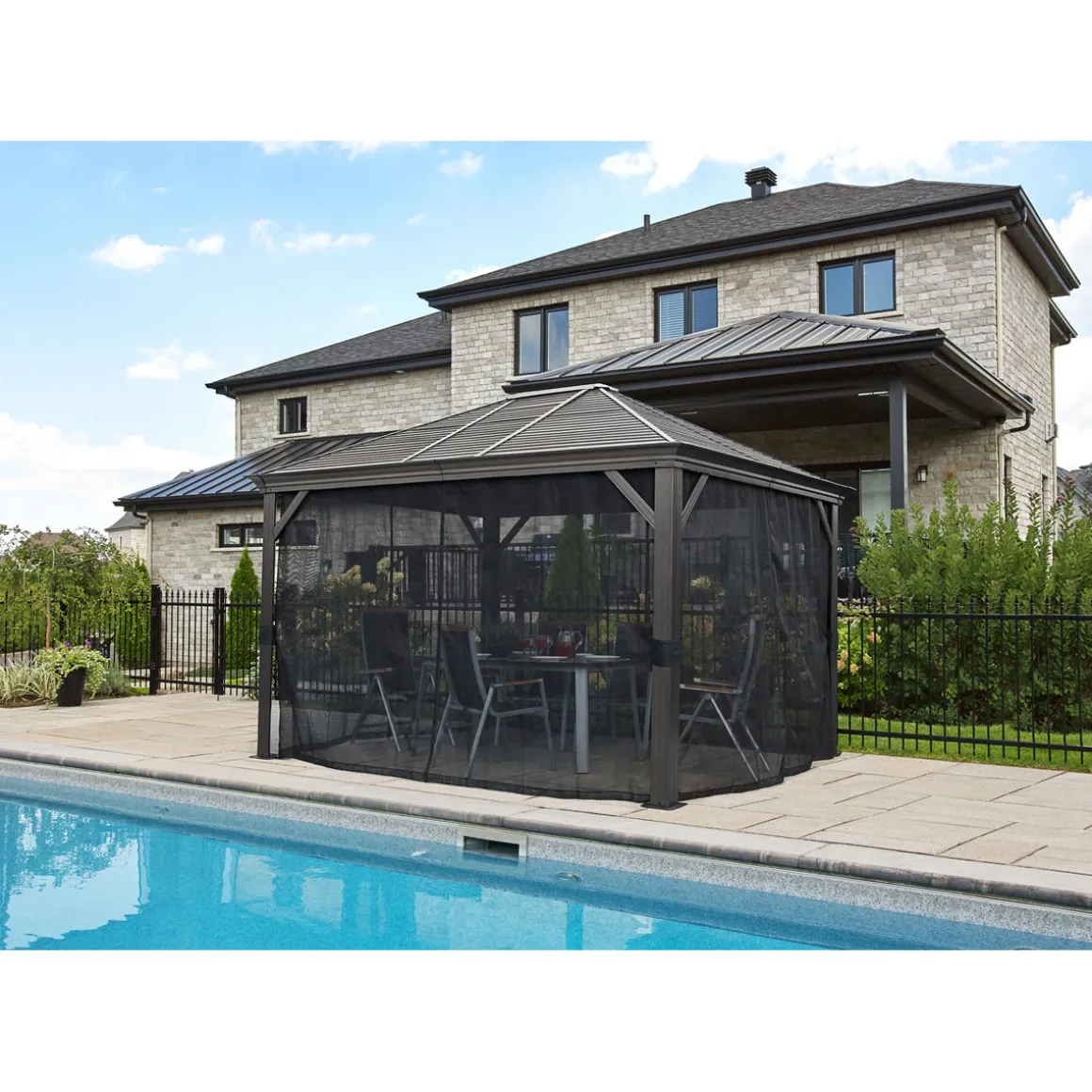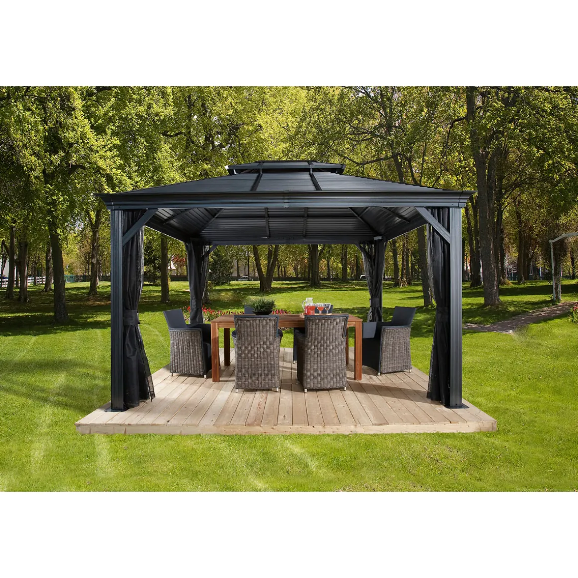 Besonderheiten: * Konzipiert für hohe Schneelasten von bis zu 150kg/m² * Doppeltes Stahldach fördert die Durchlüftung * Integrierte Regenrinne * Witterungsbeständig * Inkl. Moskitonetzen * Für den ganzjährigen Außenbetrieb entwickelt