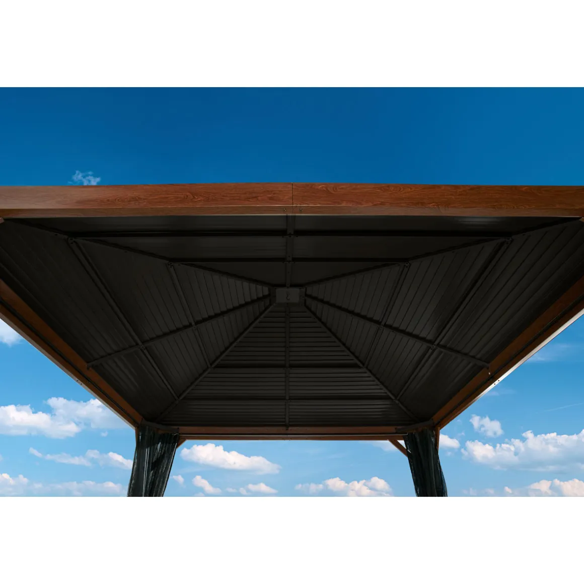 Kanadas Nr. 1 in Pavillons SOJAG Premium Aluminium Pavillon Valencia 12×12 mit HardTop Modern, langlebig und eine tolle Optik sind Merkmale für die neuen Aluminiumpavillons vom größten und bekanntesten kanadischen Pavillon Produzenten SOJAG. Der wesentliche Unterschied zu anderen Pavillons liegt im Material des Daches. Hier wird anstelle von Kunststoffplatten oder Stoff langlebiger und ständig formschöner Stahl verwendet. Außergewöhnliche 150kg/m² Schneelast und alle Aluminiumteile dauerhaft rostfrei! Die galvanische Beschichtung hält sämtlichen Witterungen ob Regen, Schnee oder Sonne ohne Probleme Stand. Das gleiche gilt für die massive Konstruktion aus resistentem, pulverbeschichtetem Aluminium (Pfostenstärke 11cm). Selbst die Schrauben bestehen aus rostfreiem Edelstahl. Der Pavillon muss daher im Winter nicht abgebaut werden. Inklusive Moskitonetzen aus beschichtetem PVC (Mesh) und zweigleisigen Laufschienen zur zusätzlichen Anbringung von Vorhängen (separat als Zubehör erhältlich). Im Gegensatz zu anderen Modellen gilt hier nicht entweder das Eine oder das Andere, sondern hier können sowohl Moskitonetze (bereits inbegriffen) und gleichzeitig Vorhänge genutzt werden. Verwechselnd echte Holzoptik – Valencia „Holz-Edition“ kommt in edler „Holz“ Optik. Der Pavillon ist mit bloßem Auge gar nicht von normalem Holz zu unterscheiden. Der Vorteil zu normalem Holz ist aber hierbei, dass der Stahl viel langlebiger und stabiler ist. Zudem kann das verzinkte Stahlblech nicht rosten. Einfacher Aufbau durch 2 Personen mit Hilfe von handelsüblichen Werkzeugen sowie einer detaillierten Schritt-für-Schritt Anleitung. Aufbauzeit ca. 5-6 Stunden. Die Füße besitzen jeweils 4 Bohrungen, dass heißt, Sie benötigen zur Befestigung am Boden 16 Schrauben und Dübel. Als Untergrund empfehlen wir eine ebene Fläche aus Holz, Beton oder Pflastersteinen. Ein Schraubenkit zur Verankerung am Boden wird nicht mitgeliefert.