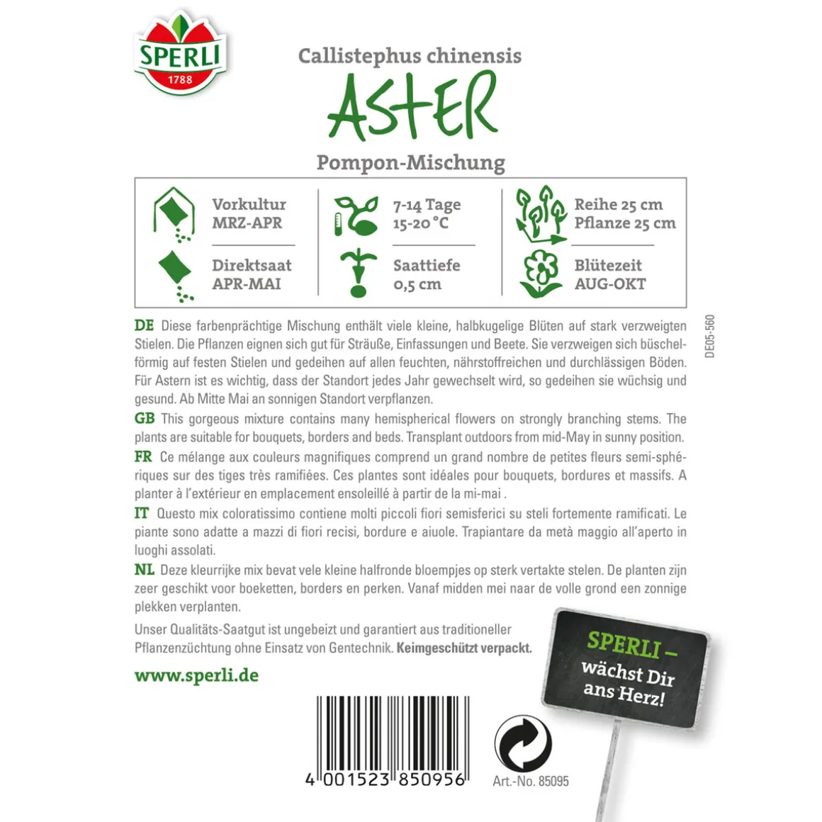 Bringen Sie Farbe in Ihren Garten mit der Sperli Astern Pompon Mischung. Diese blühende Schönheit ist perfekt für den halbschattigen Standort und wird Ihre Gartensaison aufhellen.