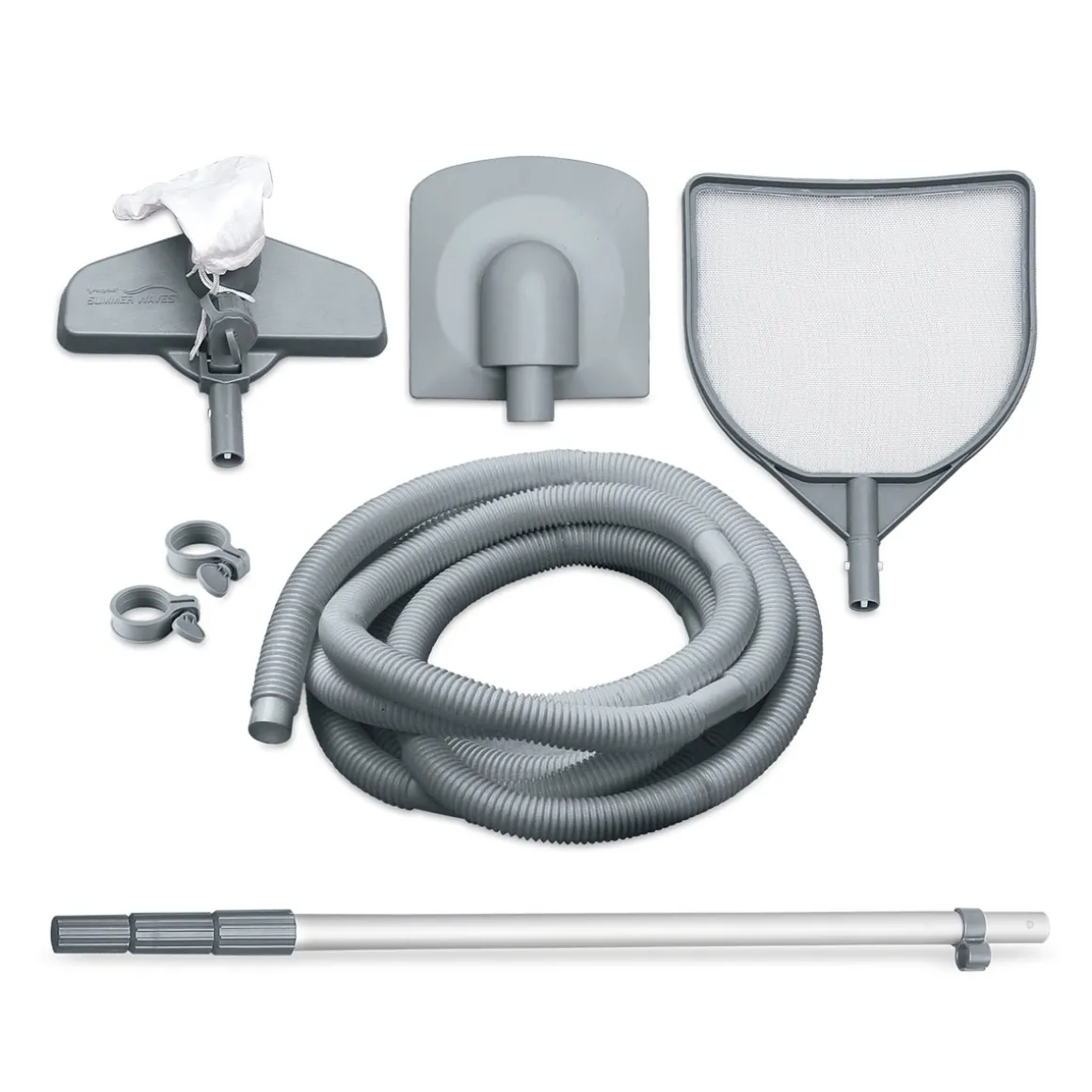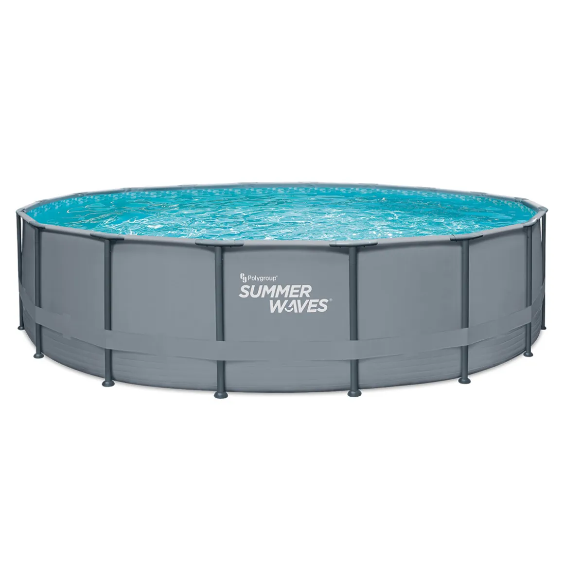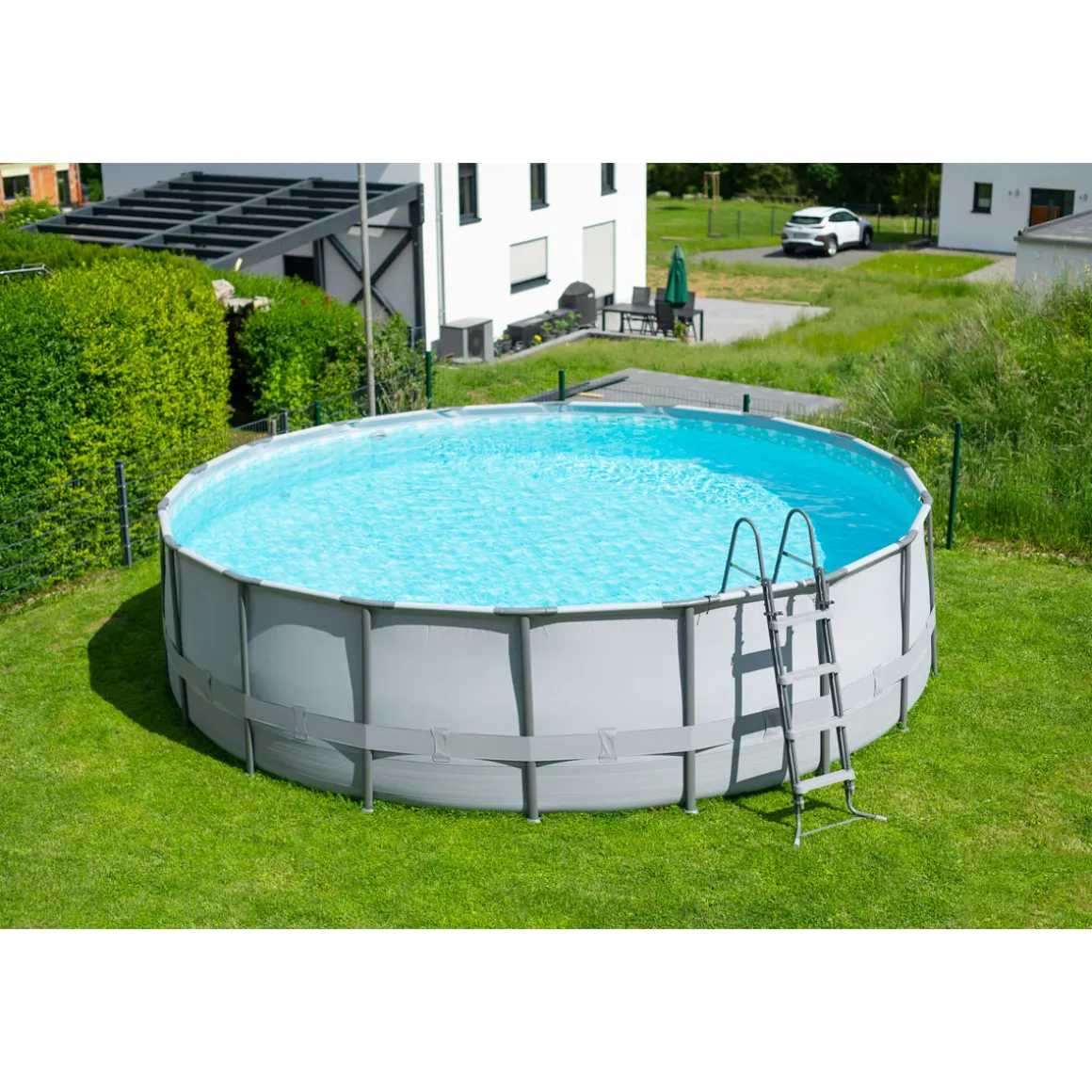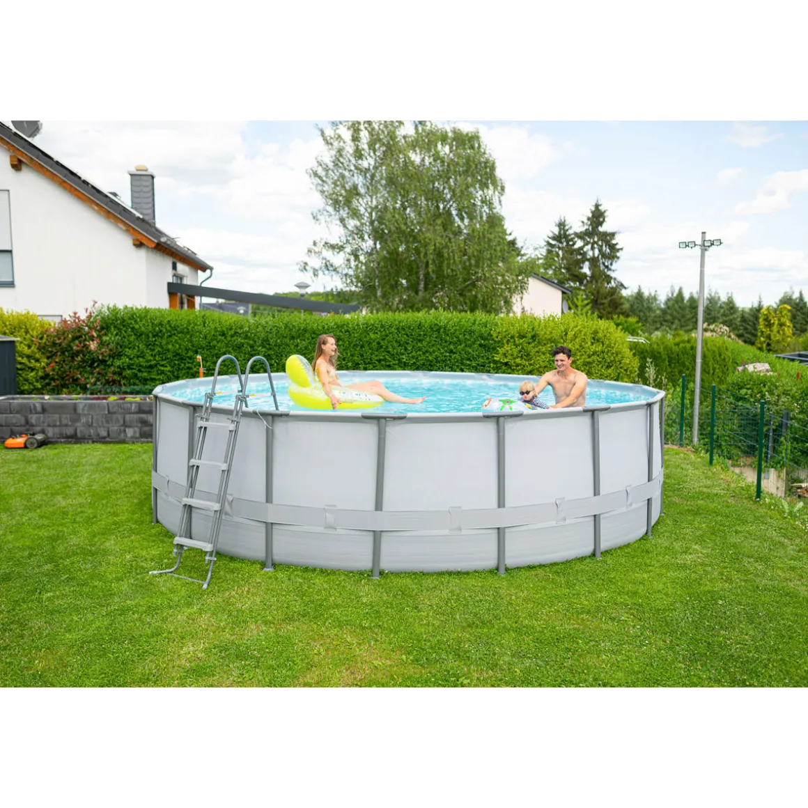 Summer Waves Elite Frame Pool Aufstellpool rund Komplettset Grau Ø 549×132 cm Abkühlung, Erfrischung und Poolspaß ohne Ende — klingt das nicht hervorragend? Der Elite Frame Pool von Summer Waves punktet mit umfangreicher Ausstattung und zuverlässiger Qualität. Verwandele deinen Garten mit dem runden Aufstellpool und wenig Aufwand in ein abwechlsungsreiches Sommerparadies! Schneller Aufbau und Poolspaß pur mit deinem Komplettset! Durch das innovative Snap-in System ist der Pool im Nu aufgebaut. Die hochwertigen Rahmenrohre aus Metall gewährleisten in Verbindung mit der strapazierfähigen Poolfolie aus einem 3-lagigen PVC-Polyester-Mix eine hohe Widerstandsfähigkeit und Stabilität. Die Highlights auf einen Blick: * Komplettset mit exklsuivem Zubehör! * Robuste Poolkonstruktion für langanhaltenden Badespaß * Maximale Stabilität durch massive Stahlrohr-Konstruktion * Hohe Belastbarkeit dank 3-lagiger PVC-Polyester-Mix Folie * Schneller und einfacher Aufbau durch Snap-in Verfahren * Füllmenge bei 90 %: 27.406 Liter Platz für ca. 8 Personen * Zeitloses Design in cleanem Grau kombiniert mit Mosaikmuster Maximale Sauberkeit dank zuverlässiger Technologie! Die mitgelieferte SkimmerPlus 2-in-1 Filterpumpe reinigt das Wasser effektiv und sorgt für klare Verhältnisse. Oberflächenablagerungen werden kontinuierlich durch die Abschöpftechnologie entfernt, sodass du den ganzen Sommer über kristallklares Wasser genießen kannst. Im Lieferumfang enthalten: * SkimmerPlus Filterpumpe mit Filterpatrone * Einstiegsleiter * Abdeckplane und Bodenvlies * Deluxe Reinigungsset Erlebe maximalen Badespaß, spritzige Abkühlung und unvergessliche Sommermomente mit dem Summer Waves Elite Frame Pool!