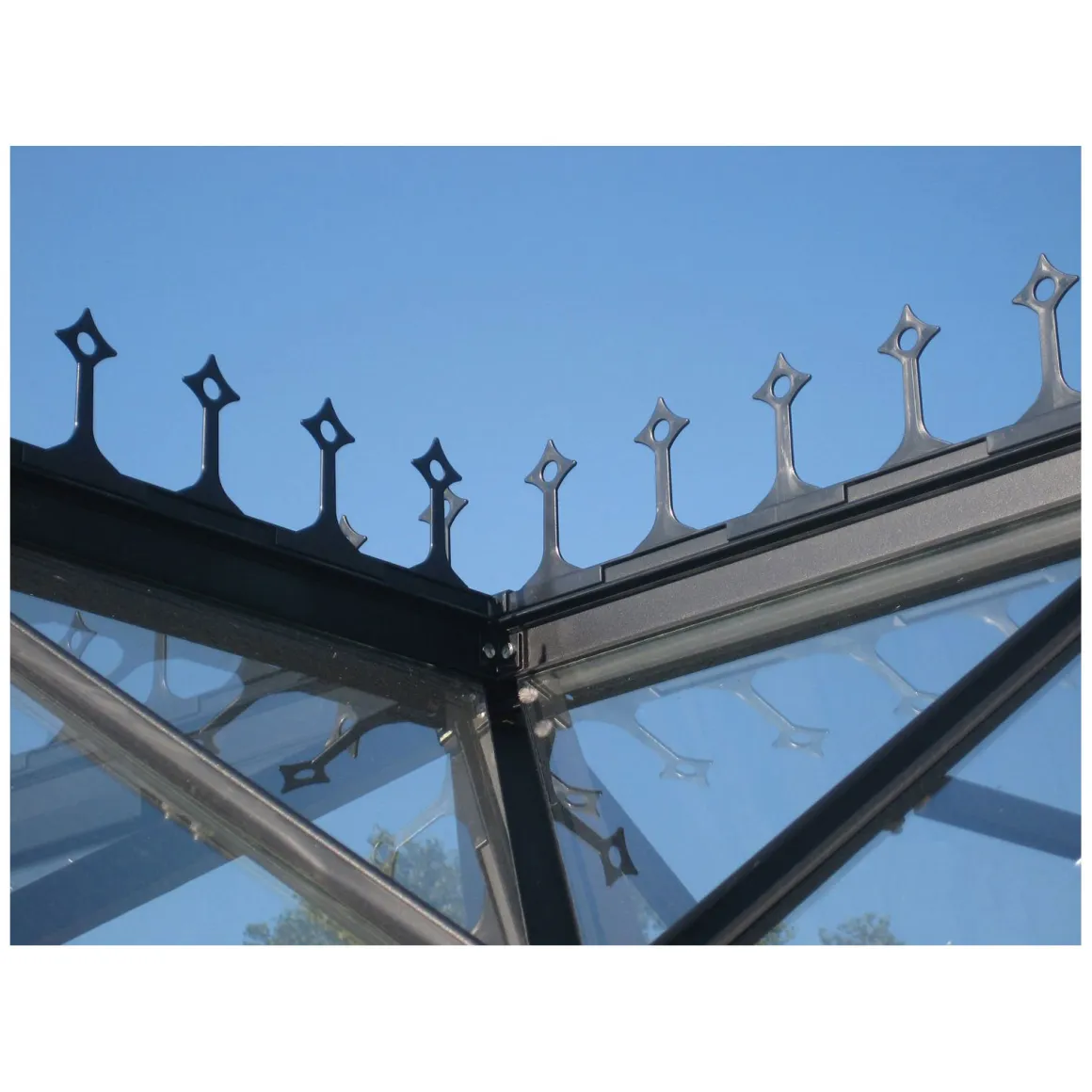 Die Firstkrone eignet sich besonders für alle Besitzer des Gewächshauses Sirius von Vitavia, die ihr Gewächshaus optisch aufwerten möchten und gleichzeitig eine effektive Taubenabwehr suchen.