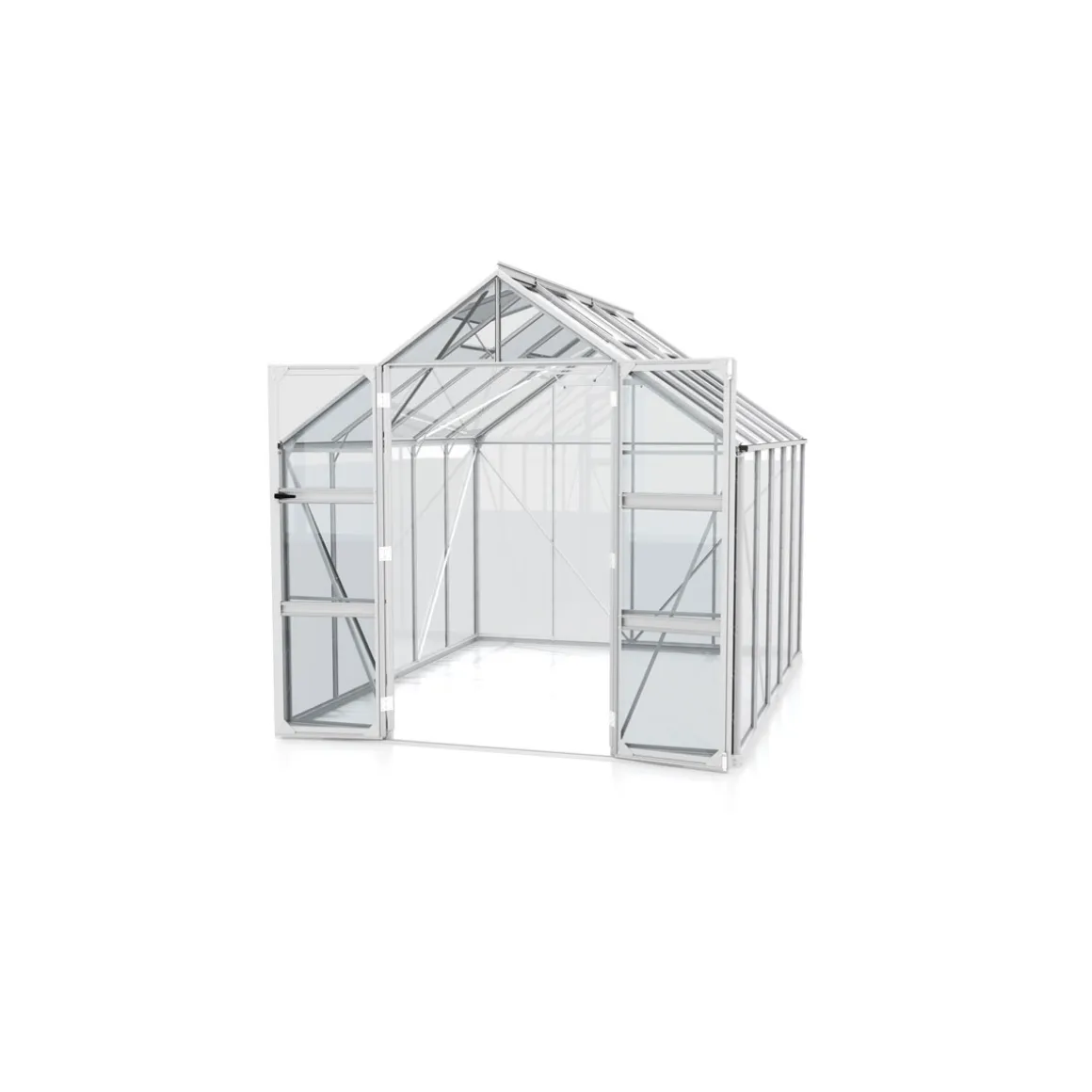 Mit dem Vitavia Gewächshaus Domus können Sie Ihre Pflanzen optimal schützen und pflegen. Das freistehende Gewächshaus bietet Ihnen eine Grundfläche von ca. 8,3 m² und ist mit einem klassischen Satteldach ausgestattet. Die Doppelschwingtüren ermöglichen einen bequemen Zugang zum Inneren des Gewächshauses.